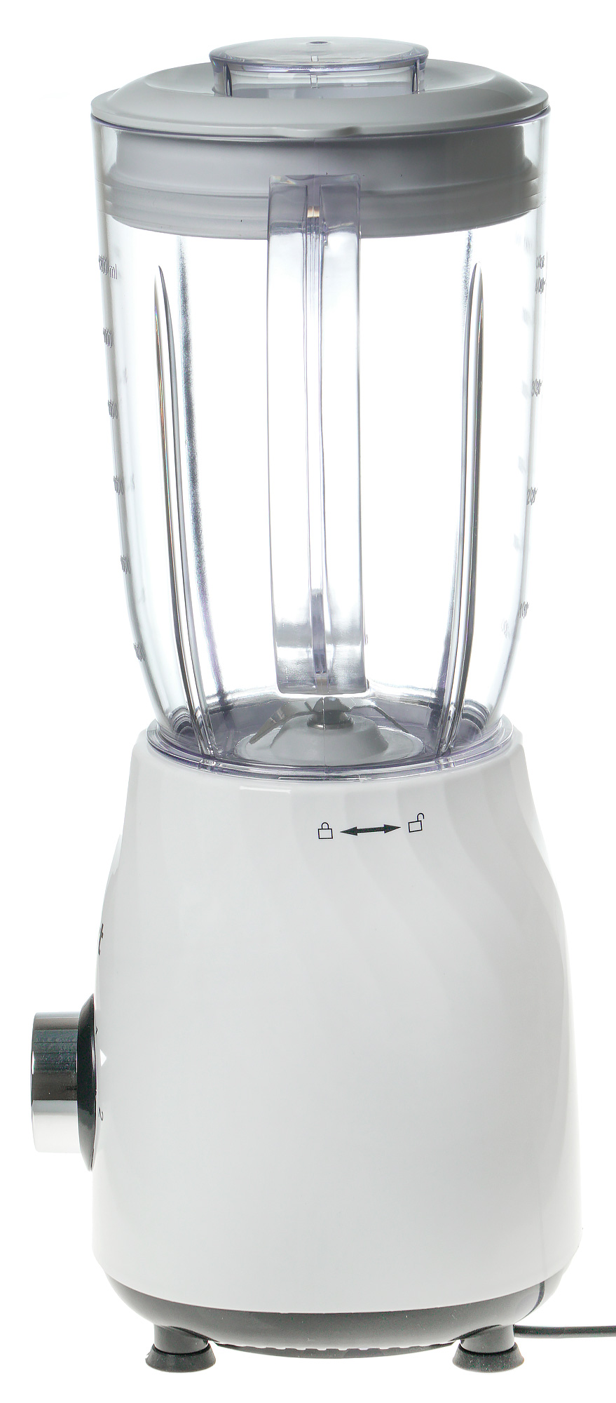 Чаша блендера представляет собой кувшин с ручкой из прозрачного пластика с нанесенной мерной шкалой на боку. Кувшин имеет удобный носик, форма его позволяет легко отмывать загрязнения. Снизу чаши располагается несъемный блок ножей, состоящий из четырех небольших лезвий. С одной стороны оси находятся ножи, с другой пластиковая крыльчатка, входящая в зацепление с крыльчаткой на моторном блоке, когда чаша установлена на него. Ножи на ось насажены через защитную силиконовую прокладку.