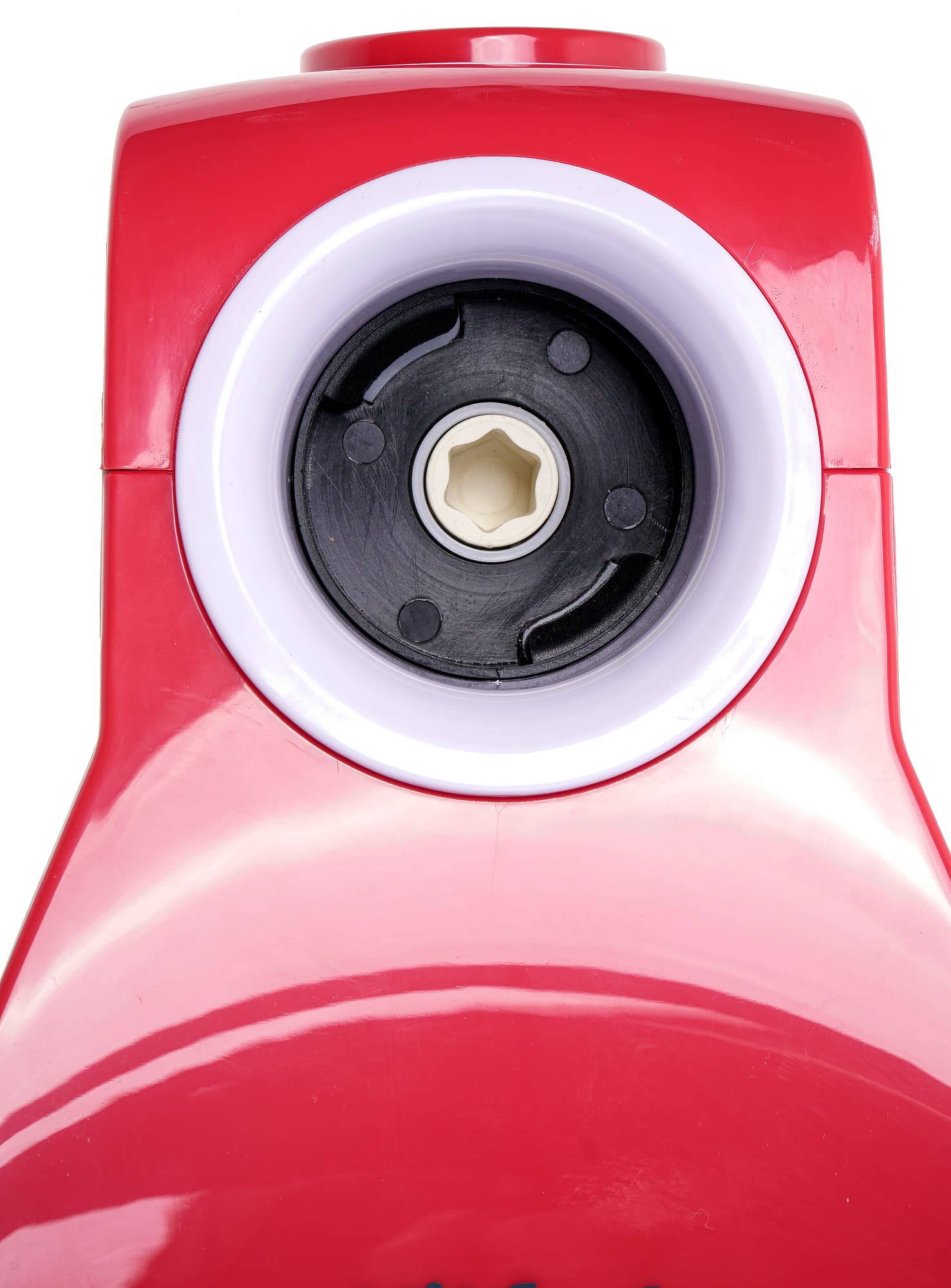 Ножевой блок, как и толкатель, выполнен из толстого прозрачного пластика. Шестигранный штырь, с помощью которого деталь крепится к моторному блоку, тоже пластиковый. Загрузочное отверстие не очень большое, но способно принять, например, среднюю картофелину целиком.