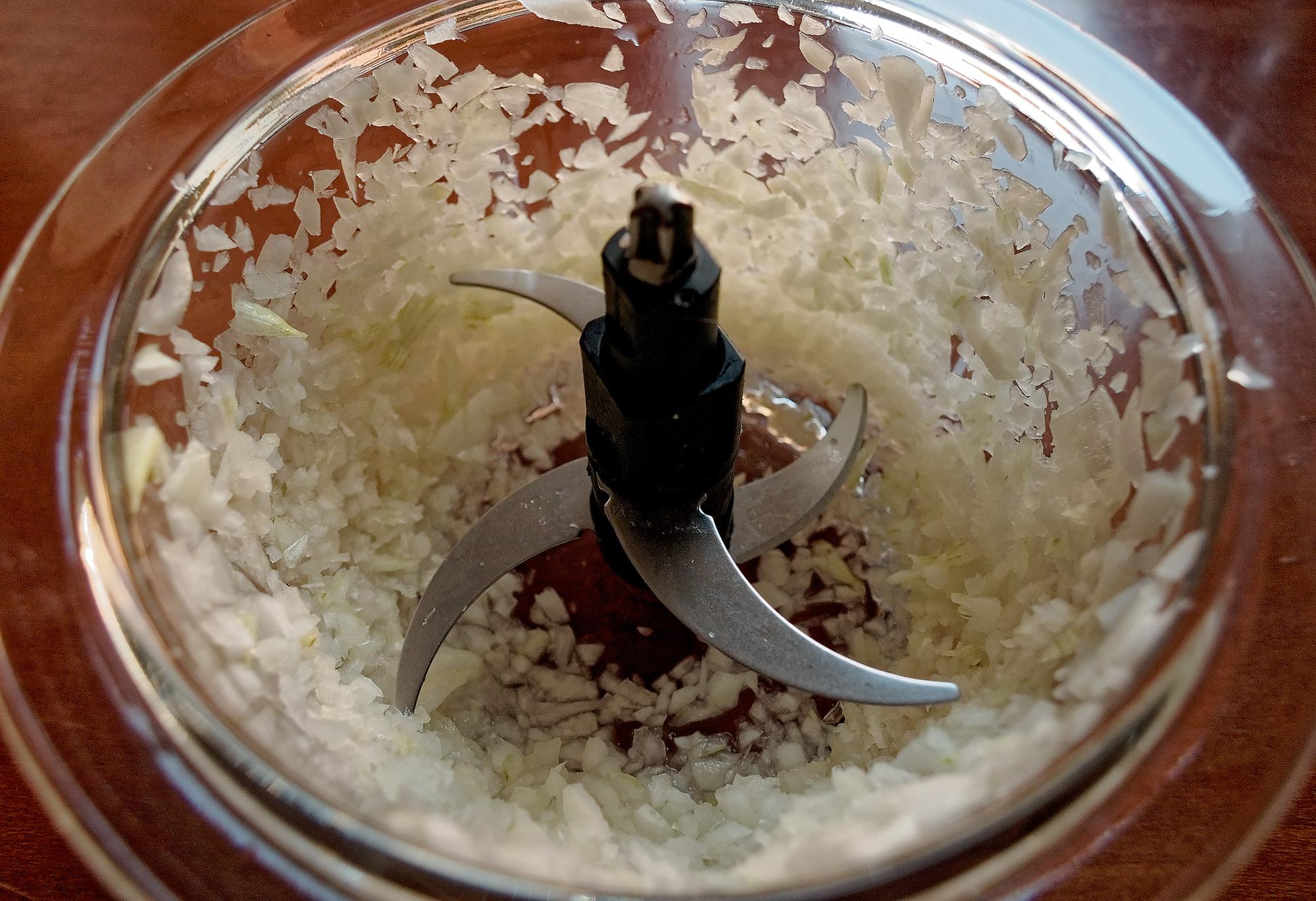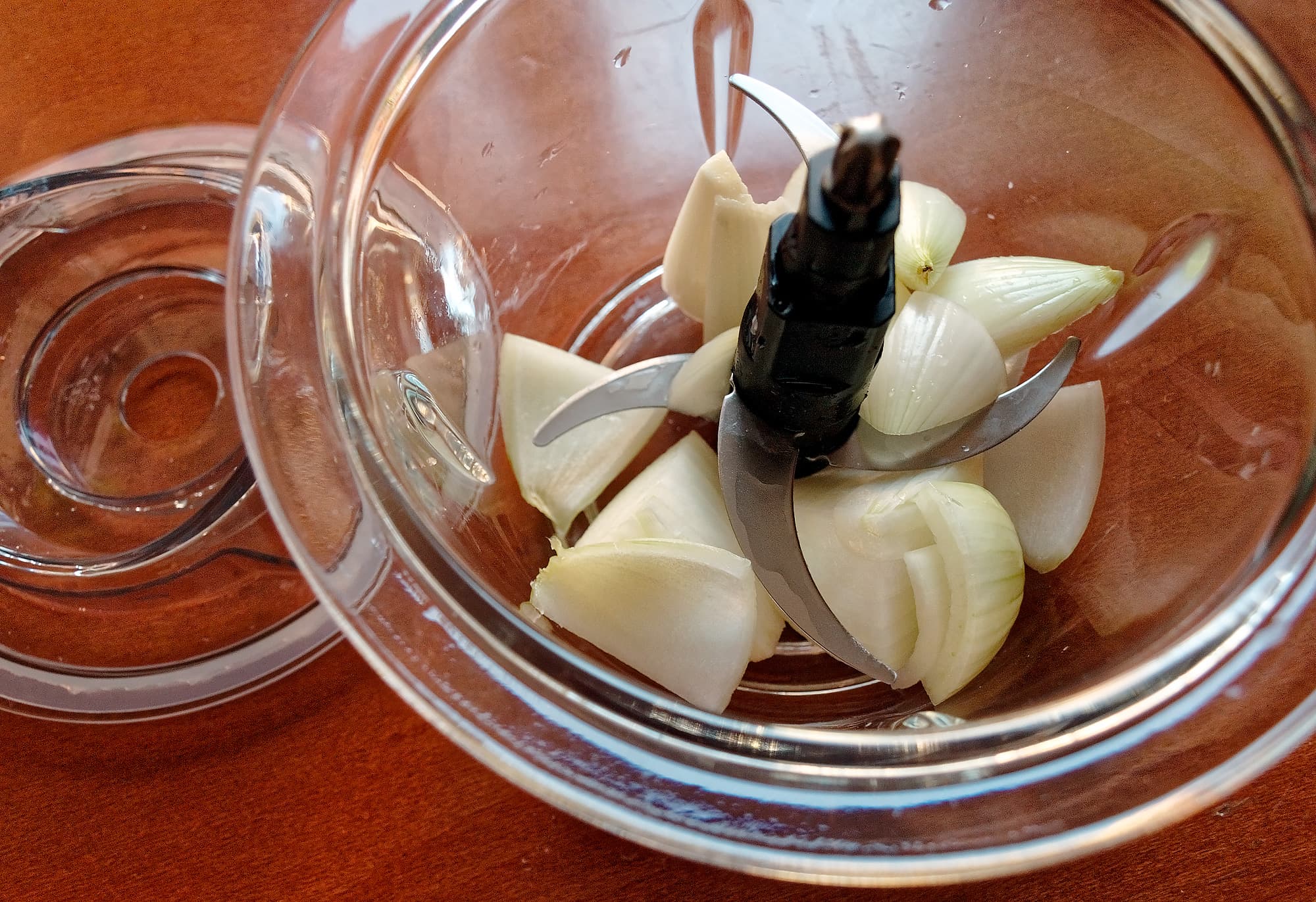 1 порезанную на кусочки по 2 см луковицу отправили в измельчитель, включили вторую скорость и не успели оглянуться, как в чаше оказался идеально порезанный лук. Процесс занял буквально секунд 5.
