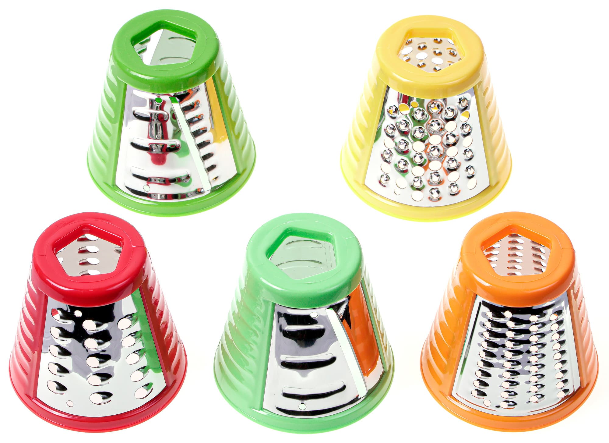 Терочные ножи представляют собой пластиковые конусы с двумя металлическими вставками. В комплекте идут: терка мелкая, терка крупная, терка-измельчитель, шинковка для нарезки крупных гладких ломтиков, шинковка для нарезки толстых волнистых ломтиков, шинковка для картофеля-фри.