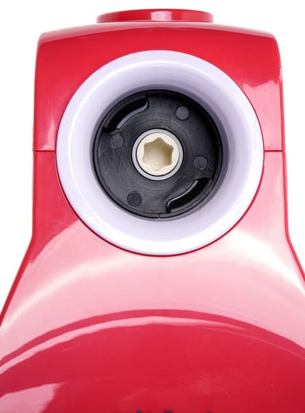 Первым делом терка радует глаз задорной расцветкой: моторный блок красно-белый, а терочные ножи все разных цветов: красный, желтый, зеленый... Прибор выглядит просто и при этом вполне надежно. Моторный блок облицован прочным на вид пластиком и устойчив за счет прорезиненных вставок на ножках. В верхней части лицевой стороны мы видим отверстие для установки ножевого блока с замком «байонет».