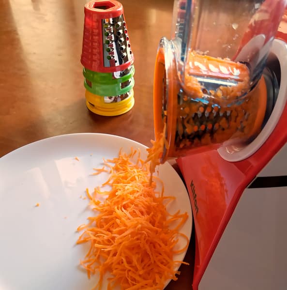 Что шинковка капусты, что натирание моркови — занятия сколь привычные, столь и муторные. Безусловный плюс электрической терки — она сводит время, затрачиваемое на них, к секундам. Так, капустный салат на двоих человек мы нарубили меньше чем за минуту — прибор собирали, кажется, дольше.