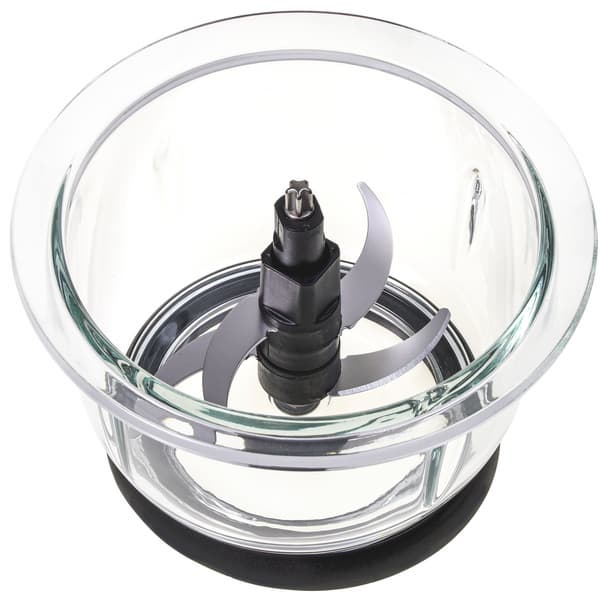 С точки зрения внешнего вида KT-1390 — совершенно стандартный представитель своего вида. Чаша выполнена из прозрачного толстого стекла, никаких рисок и отметок на ней нет. На дне чаши мы видим неподвижный металлический штифт, на который устанавливаются ножи. Ножек у чаши нет, но на поверхности она располагается устойчиво. Для подстраховки и снижения шума можно подложить под нее заботливо предоставленное производителем резиновое кольцо.