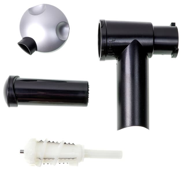 Насадка для замороженных десертов и ее толкатель выполнены из черного пластика. Сама насадка в коробке лежит в собранном виде, но легко разбирается: передняя часть с дозатором снимается поворотом вправо, о чем сообщают рельефные пиктограммы на корпусе насадки. Внутри обнаруживаем белый пластиковый шнек, на котором расположены зигзаговидные острые ножи.