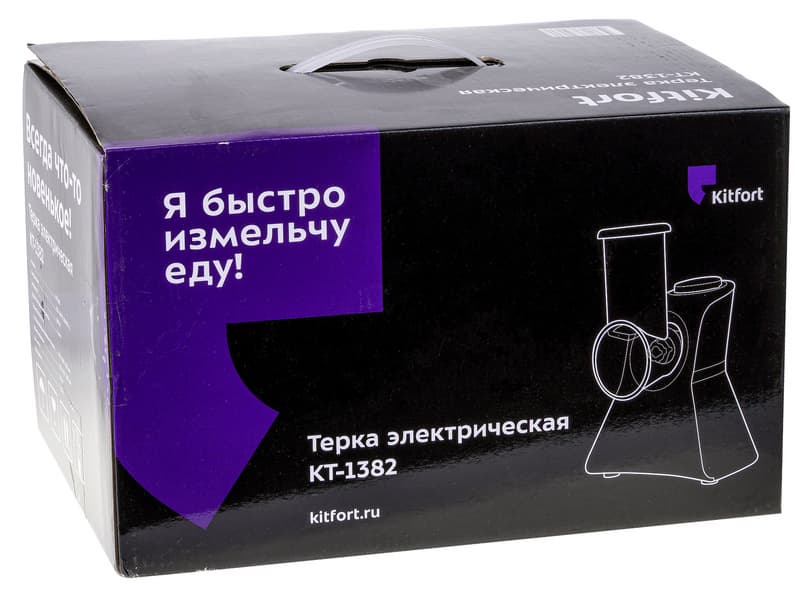 Упаковка, как и всегда у Kitfort, лаконична: на черно-фиолетовом фоне белый силуэт прибора, название, модель. По бокам технические характеристики и некоторая информация о работе устройства. Коробка небольшая, да и весит немного, и все же снабжена ручкой для переноски.