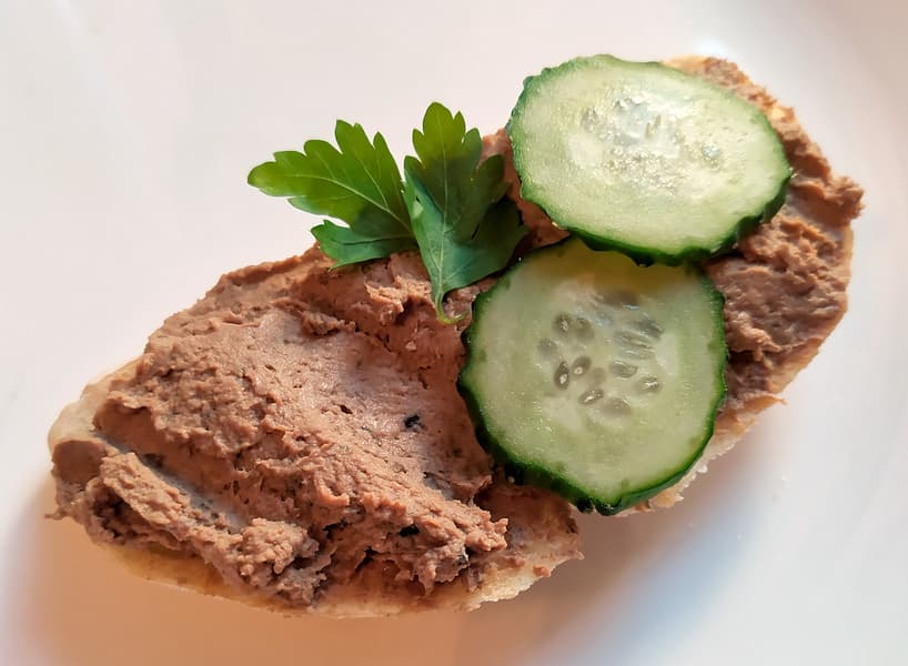 Когда паштет был практически готов, забросили в чашу горсть маслин и пробили все в импульсном режиме 4 раза, чтобы оливки остались небольшими кусочками. Отличный получился паштет! Довольно плотный, потому что жидкости, кроме коньяка, мы не добавляли, но совершенно однородный. Пятерка!