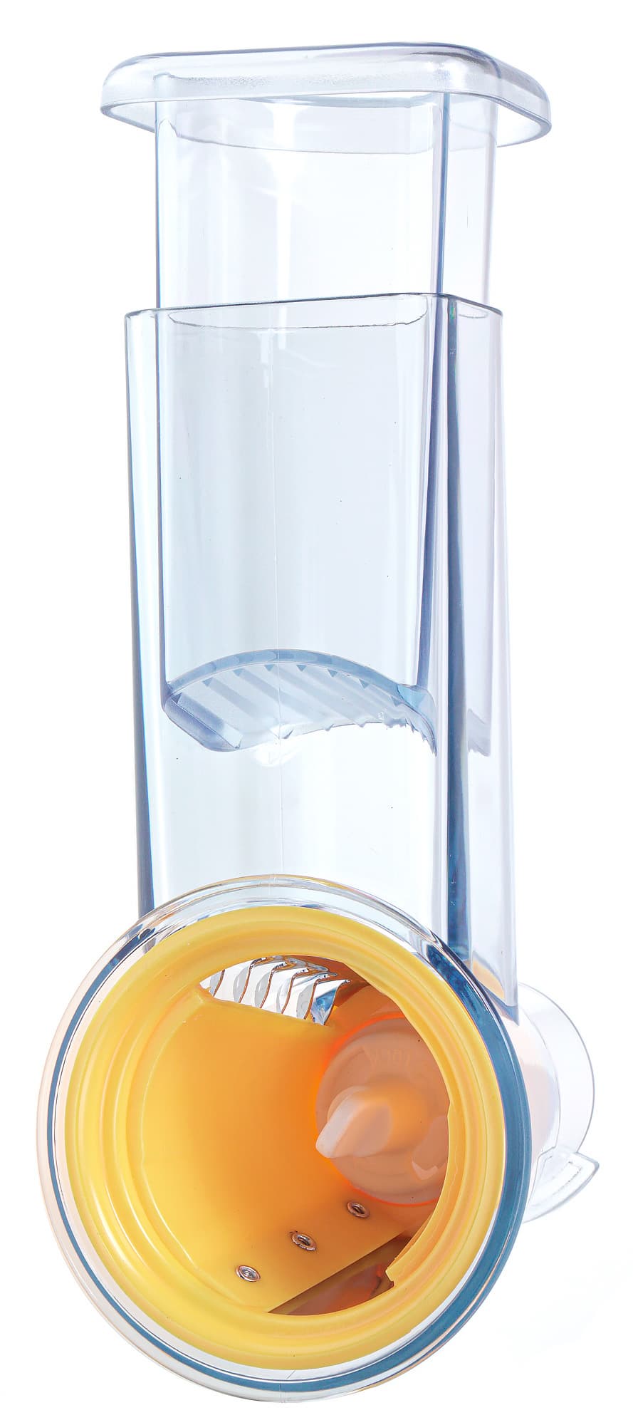 Нельзя также не отметить безопасность такого устройства: в отличие от терки классической, вы никак не соприкасаетесь с ножами во время работы прибора, так что шанс пораниться нулевой — и волки сыты, и пальцы целы.