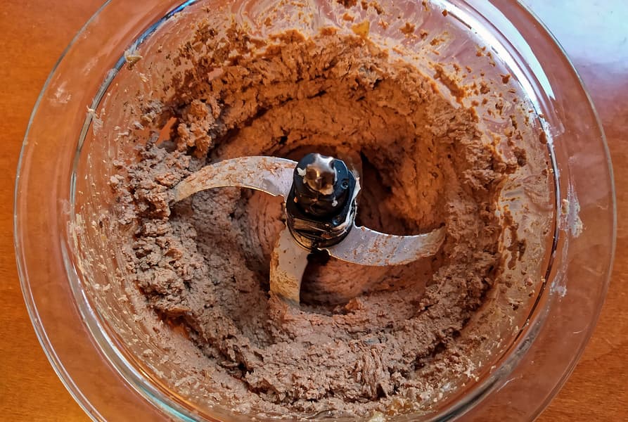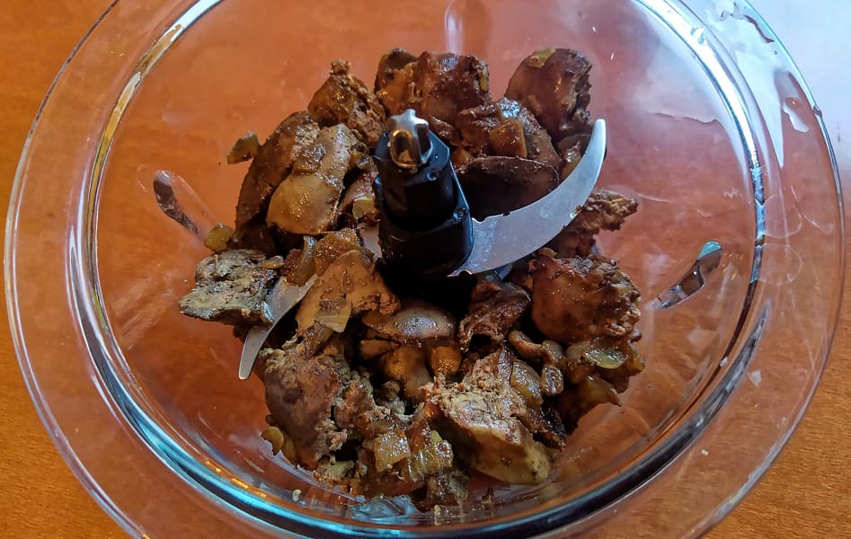 Проверим, как измельчитель справляется с превращением продуктов в однородную массу. Поджарили 1 луковицу и зубчик чеснока, добавили 350 граммов куриной печени, довели до готовности, плеснули 20 мл коньяка и отправили все это в чашу измельчителя.