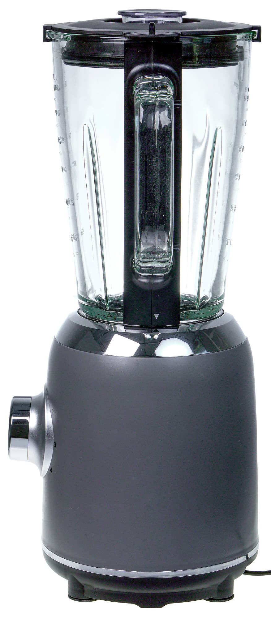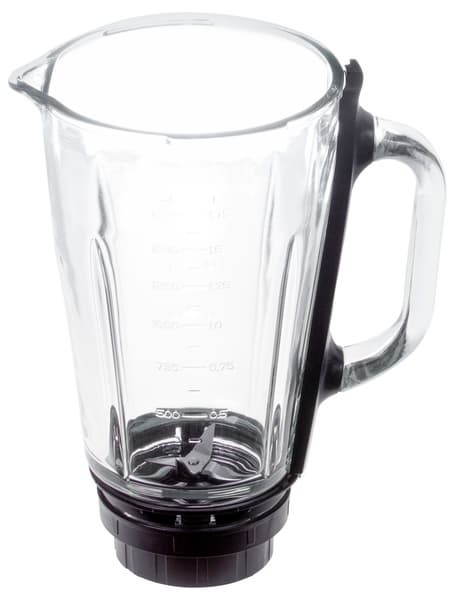 Чаша для смешивания изготовлена из стекла, имеет ручку и носик для облегчения слива готового продукта. Рабочий объем стакана — 1,7 л. На боковых сторонах нанесены отметки объема от 500 до 1750 мл, а также от 2 до 7 чашек или от 16 до 56 унций. Емкость примечательна своей формой с малым диаметром дна и довольно широкой верхней частью. Поскольку нижняя часть кувшина узкая, в нем можно будет перерабатывать небольшие объемы продуктов. На внутренней поверхности имеется четыре вертикальных выступа, обеспечивающих равномерное смешивание продуктов.