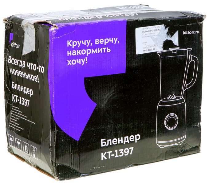 Блендер Kitfort KT-1397 поставляется в картонной коробке, оформленной в, что называется, энергичной черно-фиолетовой гамме. Тестовая информация и стилизованное изображение прибора представлены в белом цвете. На боковых сторонах можно ознакомиться с техническими характеристиками блендера и его особенностями. Традиционно для Kitfort, дизайн упаковки простой (в хорошем смысле этого слова), не перегруженный смыслами и дающий первое впечатление об аппарате, находящемся внутри. Ручкой для переноски упаковка не оснащена.