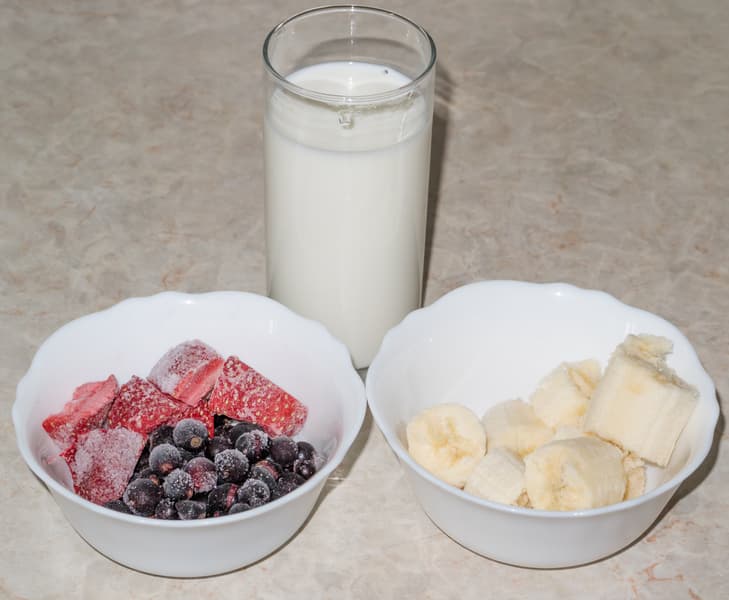 Для приготовления мы взяли один банан, отыскали в морозилке одну крупную ягоду клубники и горсть черной смородины. Банан поломали, клубнику разрезали на четыре части. Положили все ингредиенты в чашу блендера и залили 250 мл молока.