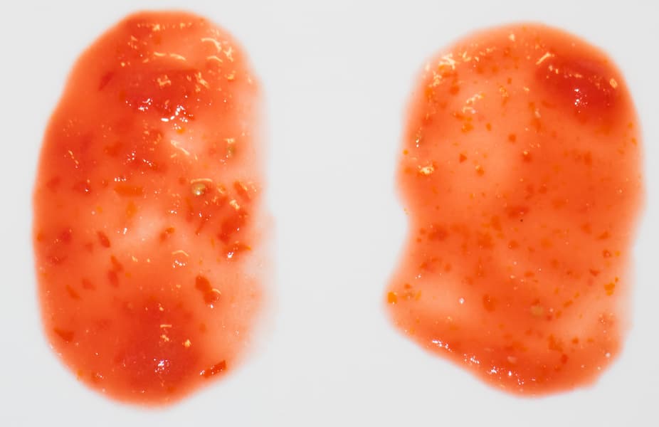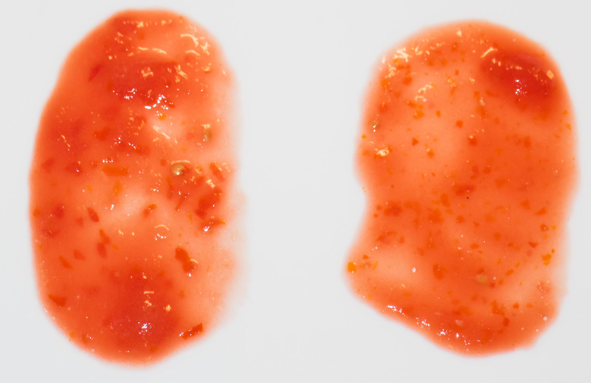 Через минуту выключили блендер и оценили результат. В томатной массе встречались кусочки шкурки и крупно размолотые косточки. Продолжили взбивать дальше на пятой скорости. По завершении еще одной минуты работы результат значительно улучшился: кусочки шкурки и семян стали гораздо мельче, масса — однороднее.