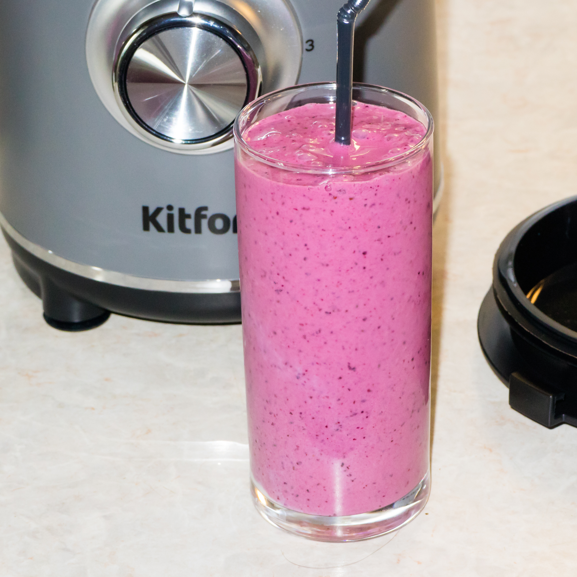 Готовили коктейль на пятой скорости полторы минуты ровно. Получили в итоге густой и неплохо взбитый напиток с насыщенным ягодным вкусом.