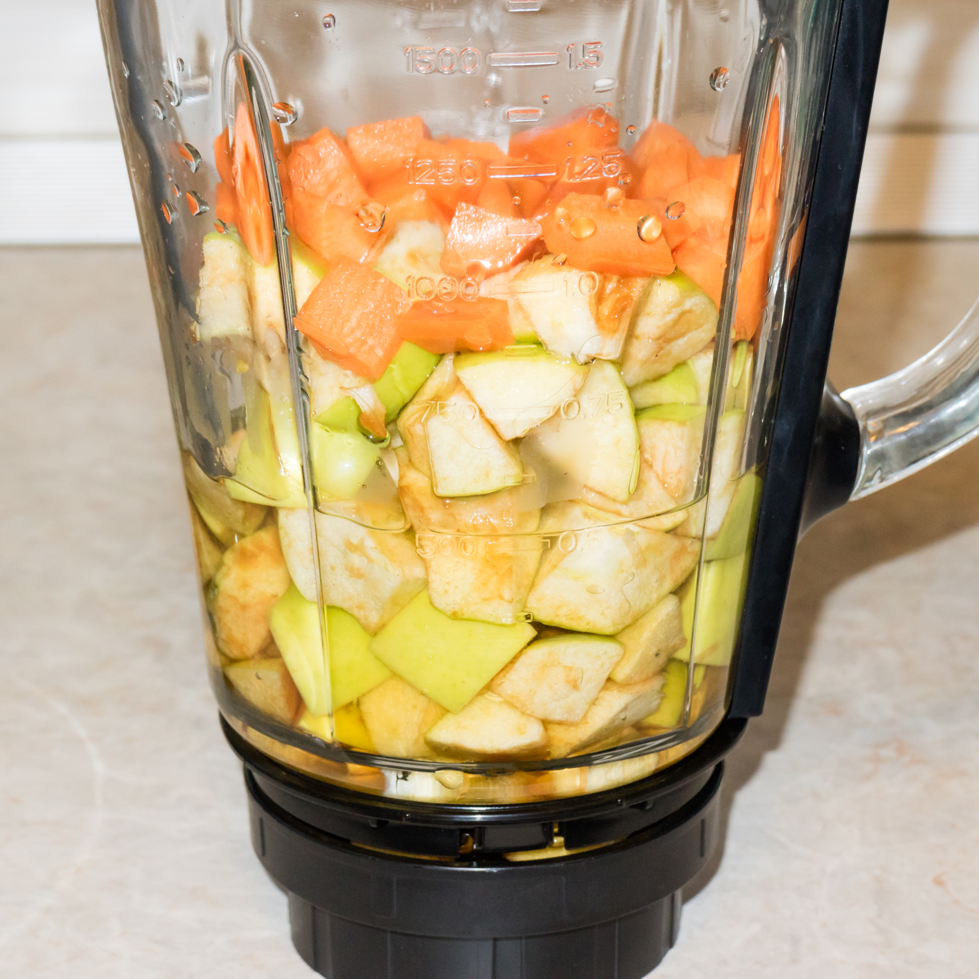 Очистили одну морковку и несколько садовых яблок. Нарезали относительно мелко, потому что тест с томатами показал, что крупные кусочки ножи перемалывают не лучшим образом. Вес подготовленных яблок составил 340 г, морковь оказалась весом всего в 90 г. Добавили к ним 250 мл яблочного сока.