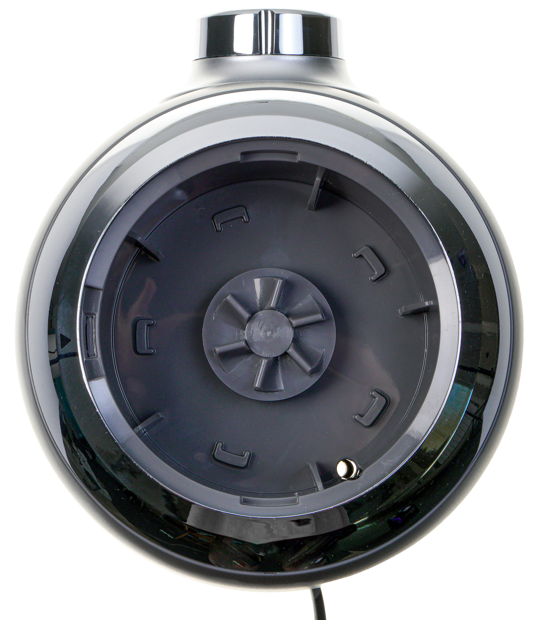 Шнур электропитания присоединяется со стороны дна. Длина шнура кажется нам достаточной при использовании устройства в обычных бытовых условиях. При хранении кабель может быть уложен в отсек, образующийся между выступом центральной части дна и стенкой, отделяющей ножки. Каждая из четырех ножек оснащена резиновой присоской диаметром 2,5 см. С обратной стороны корпуса также размещены несколько блоков вентиляционных отверстий.