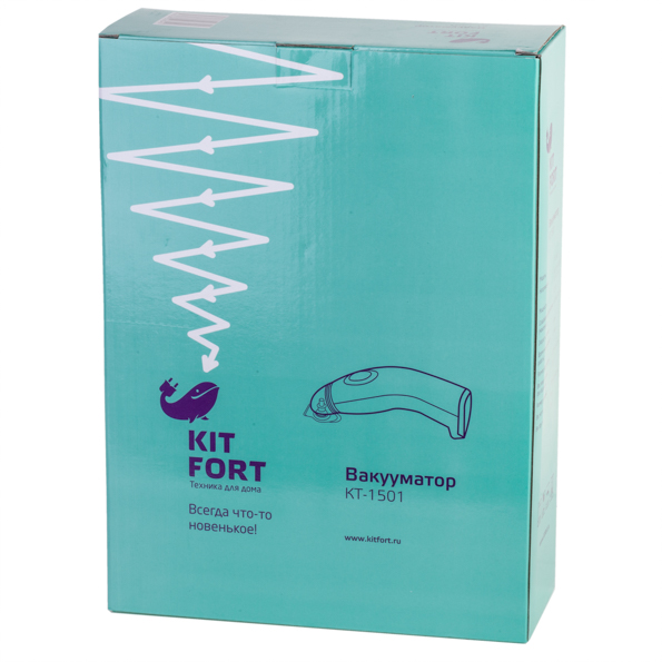 Вакуумный упаковщик Kitfort KT-1501 поставляется в картонной коробке-параллелепипеде голубого цвета, на которой красуется хорошо известный любителям марки симпатичный кит и изображение прибора. По бокам располагается краткая информация об основных особенностях и характеристиках продукта.