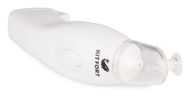 Визуально вакууматор удивляет: это небольшой аппарат фаллической формы с пластиковым колпачком сверху. На торце колпачка — присоска; управление — одна большая кнопка. Kitfort KT-1501 совсем миниатюрный по сравнению с упаковщиками, которые встречались нам ранее, его удобно держать в руке. К тому же, аппарат сверхлегкий: вес устройства без батареек составляет всего-навсего двести граммов.