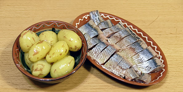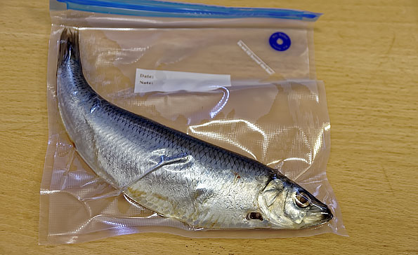 Затем поместили в вакуум жирную малосольную бочковую селедку.
