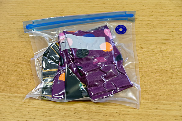 Целиком процесс вакуумирования пакетов выглядит следующим образом. Сначала берем пакет и помещаем туда то, что мы собираемся вакуумировать, закрываем застежку зип-лок, стремясь с первого раза сделать это как следует. Пластиковые детали зип-лока довольно жесткие, усилие требуется отчетливое, но к этому быстро привыкаешь — а если воспользоваться специальной клипсой, прилагаемой в комплекте, то и привыкать не надо, становится сильно удобнее. Затем просто приставляем присоску вакууматора к пакету и откачиваем воздух.