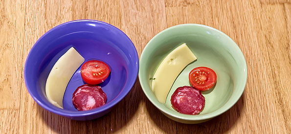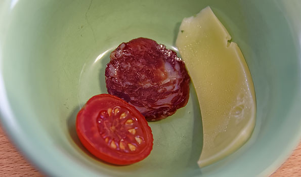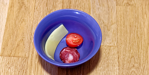 Сначала мы взяли подходящую под размер крышки салатницу и положили туда кусочек свежего сыра, только что отрезанной колбасы и половинку помидора. Имитируем ситуацию, когда после ужина или вечеринки остались недоеденные продукты — такое бывает у всех.