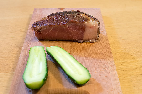 Через три часа мы достали говядину из воды, охладили и поместили в холодильник до лучших времен. Через 15 дней (максимальный срок, согласно таблице для готовых блюд) стейки достали из вакуума и в течение нескольких минут обжаривали на сковороде.
