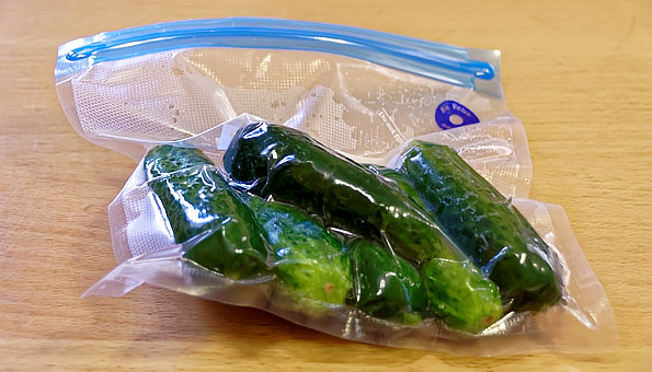 Производитель рекомендует попробовать изготовить малосольные огурцы прямо в вакуумном пакете по дороге на пикник. Мы же поступили проще: запаковали уже готовые малосольные огурцы.