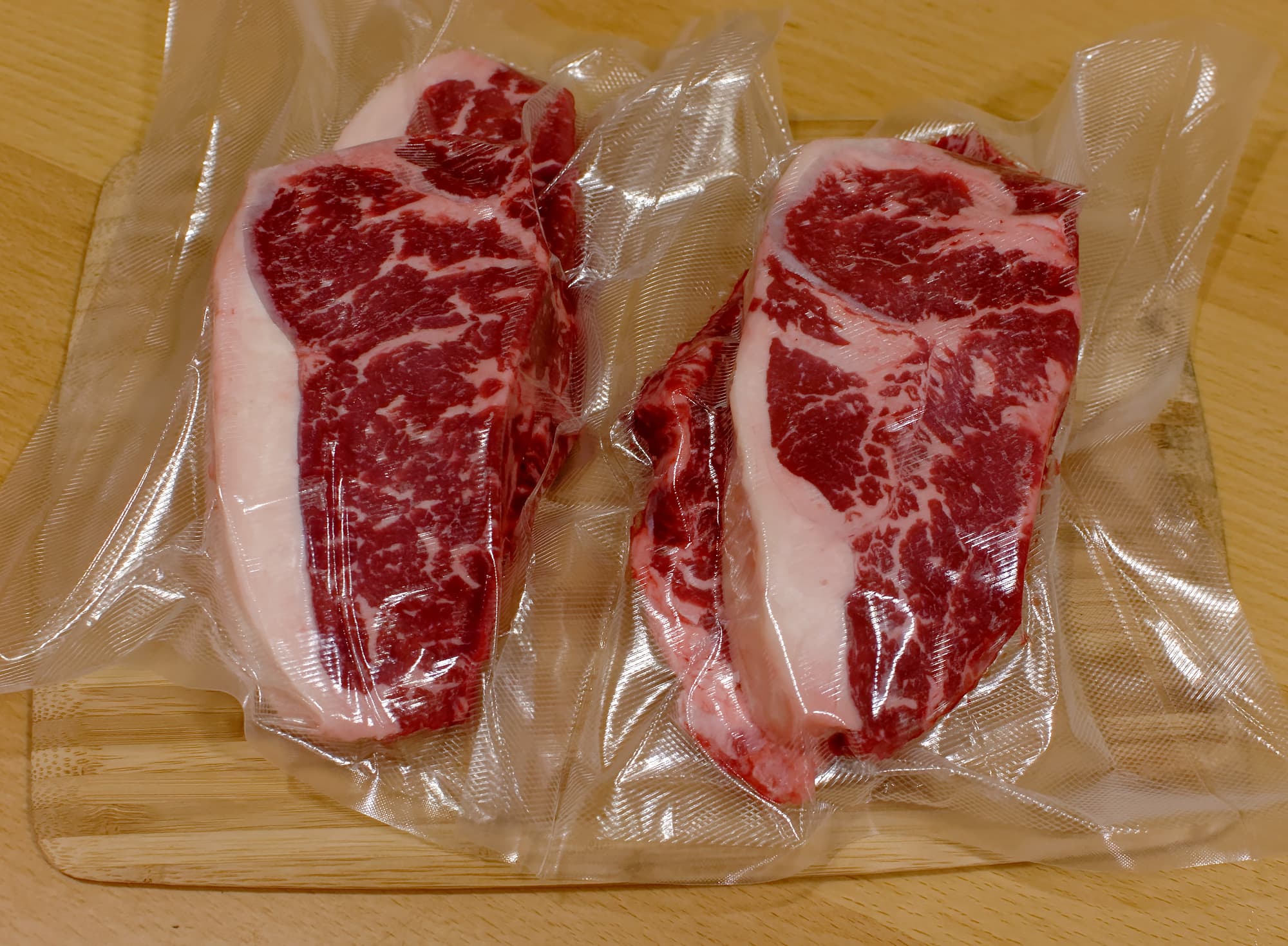 Для приготовления стейка мы взяли подходящий кусок мяса, нарезали его на куски соответствующего размера и вакуумировали.