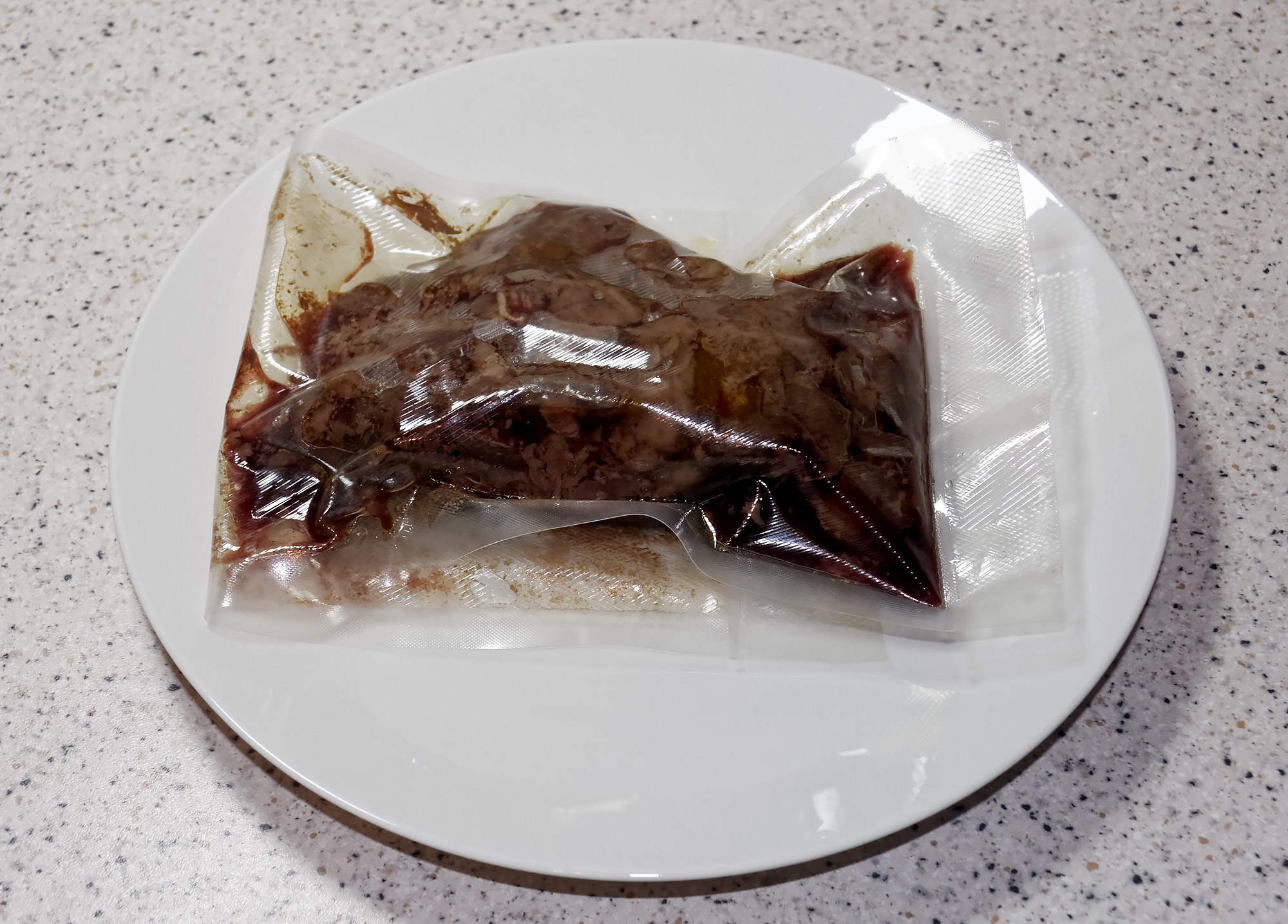 В поисках новых идей для тестов мы заглянули в морозилку, где обнаружили небольшое количество (около 500 граммов) обрезков оленьего мяса. В качестве отдельного блюда оно явно не годилось (как по внешнему виду, так и по вкусовым характеристикам — мясо было довольно жестким и жилистым), поэтому мы решили вакуумировать его и приготовить в су-виде.
