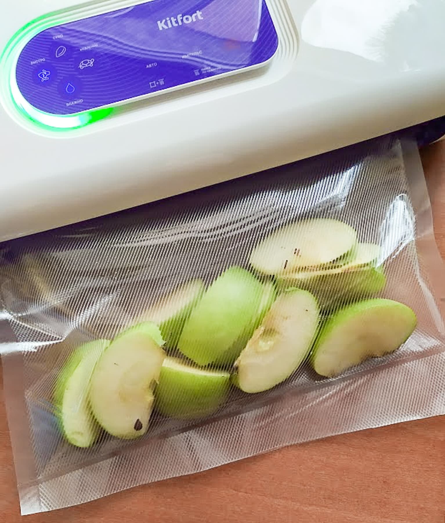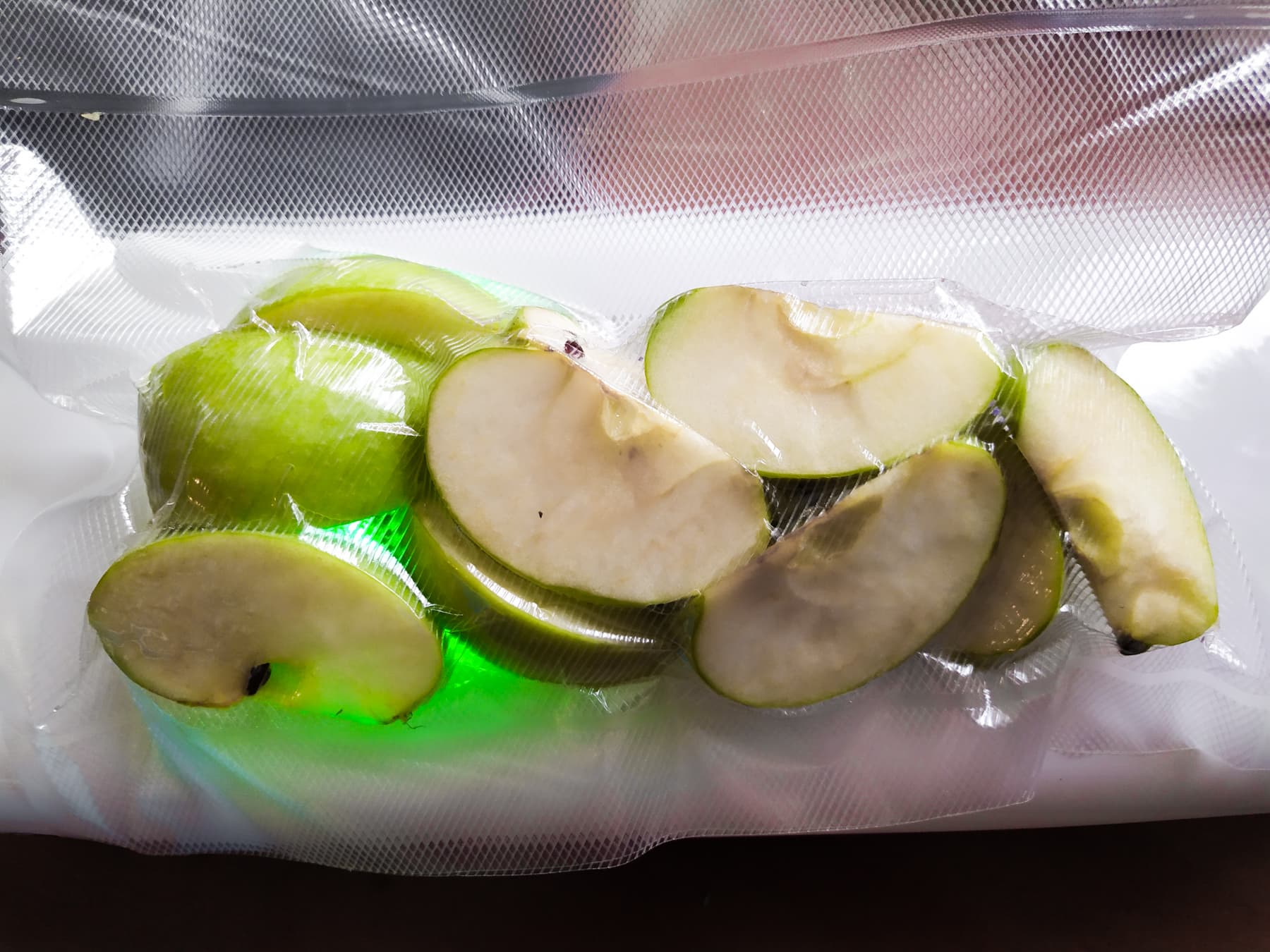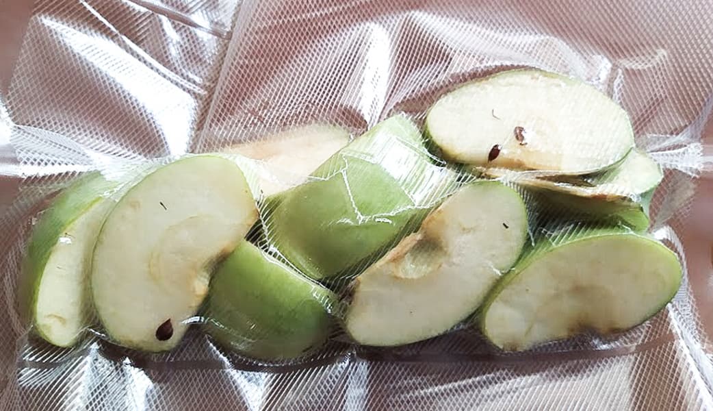 От одного из параллельных тестов у нас осталось немного яблочных долек, уже чуть окислившихся. Есть не хотелось, вот мы и решили завакуумировать их и проверить, как они сохранятся в пакете.