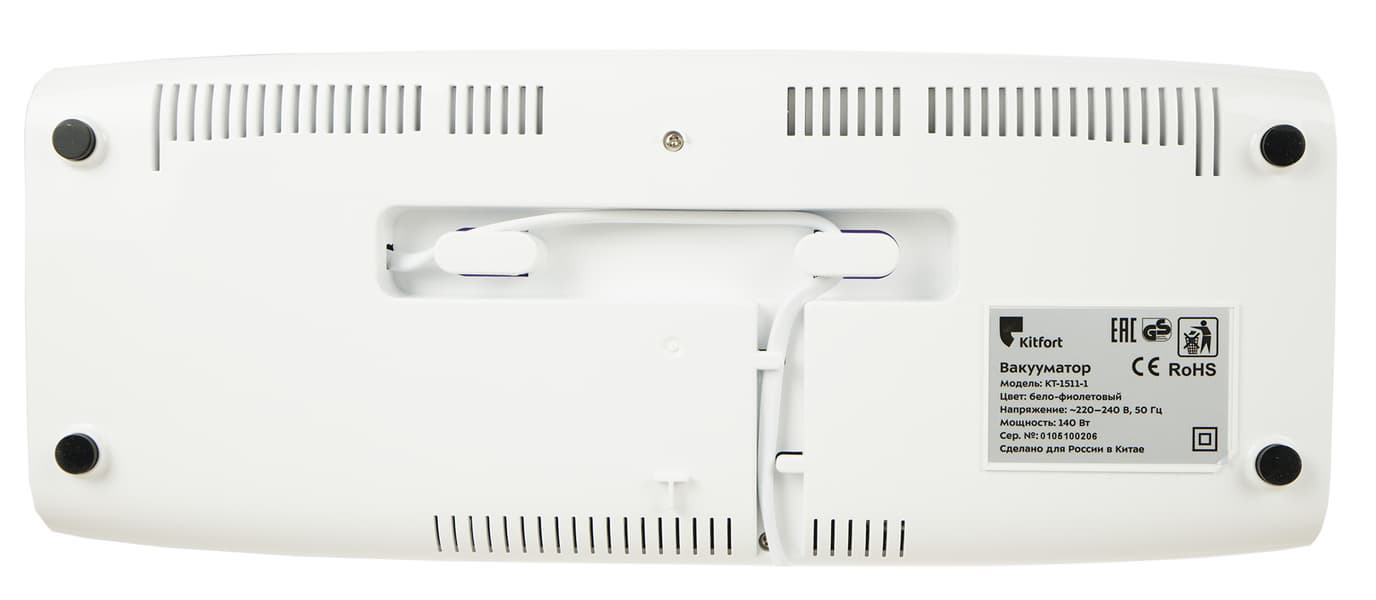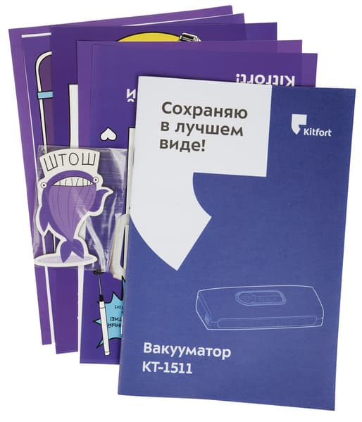 Коробка оформлена в узнаваемом стиле Kitfort: на черном фоне векторное изображение вакууматора, в левом верхнем углу — фиолетовая вставка со слоганом, намекающим на специализацию прибора. На боковых гранях коробки — список основных технических характеристик Kitfort KT-1511.