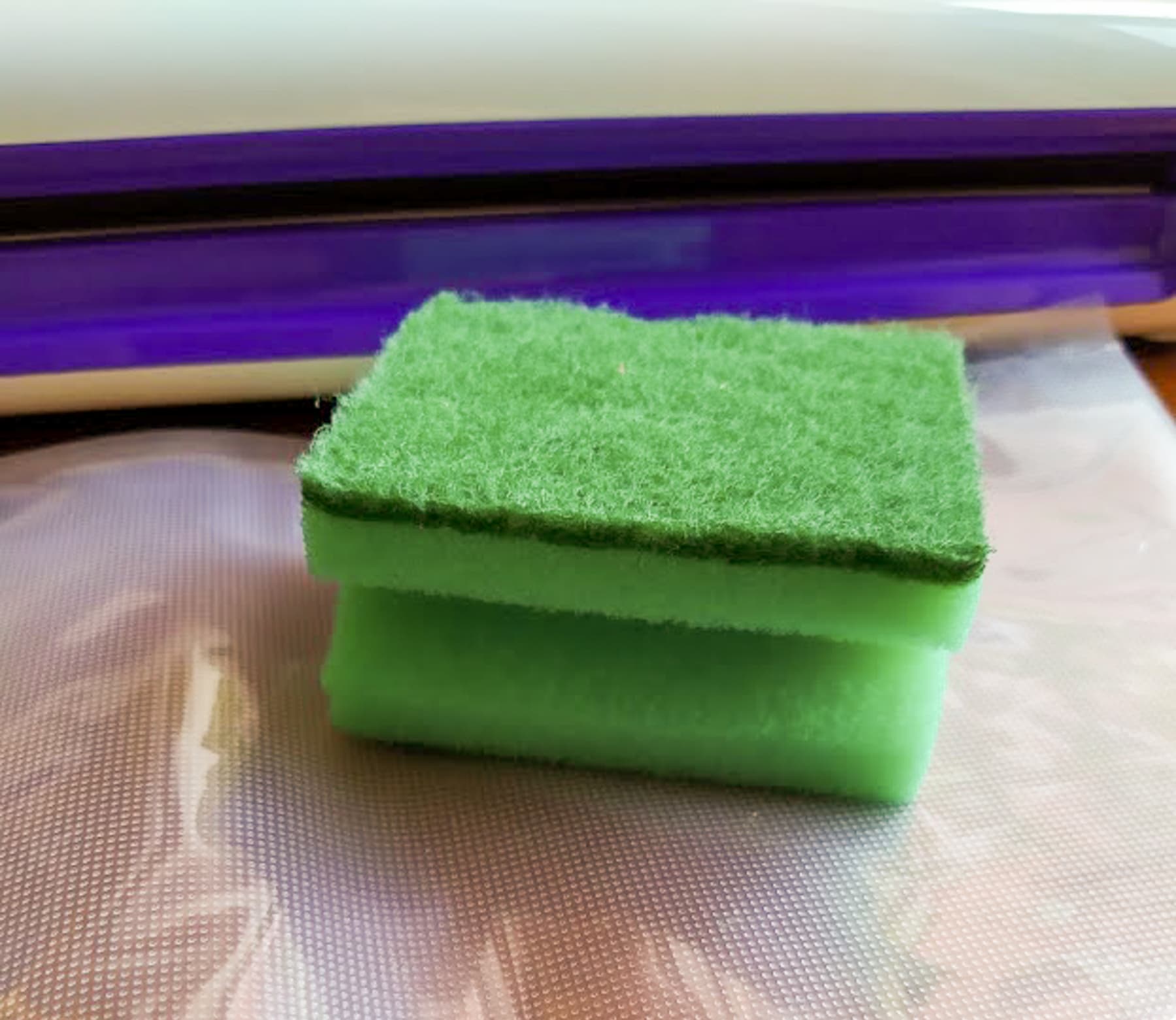 Воздух в режиме «Сухо/Быстро» откачивался 15 секунд, еще 10 секунд ушло на запаивание шва. Губка стала совершенно плоской, как будто мы завакуумировали кусочек тонкой зеленой материи на плотной подложке.