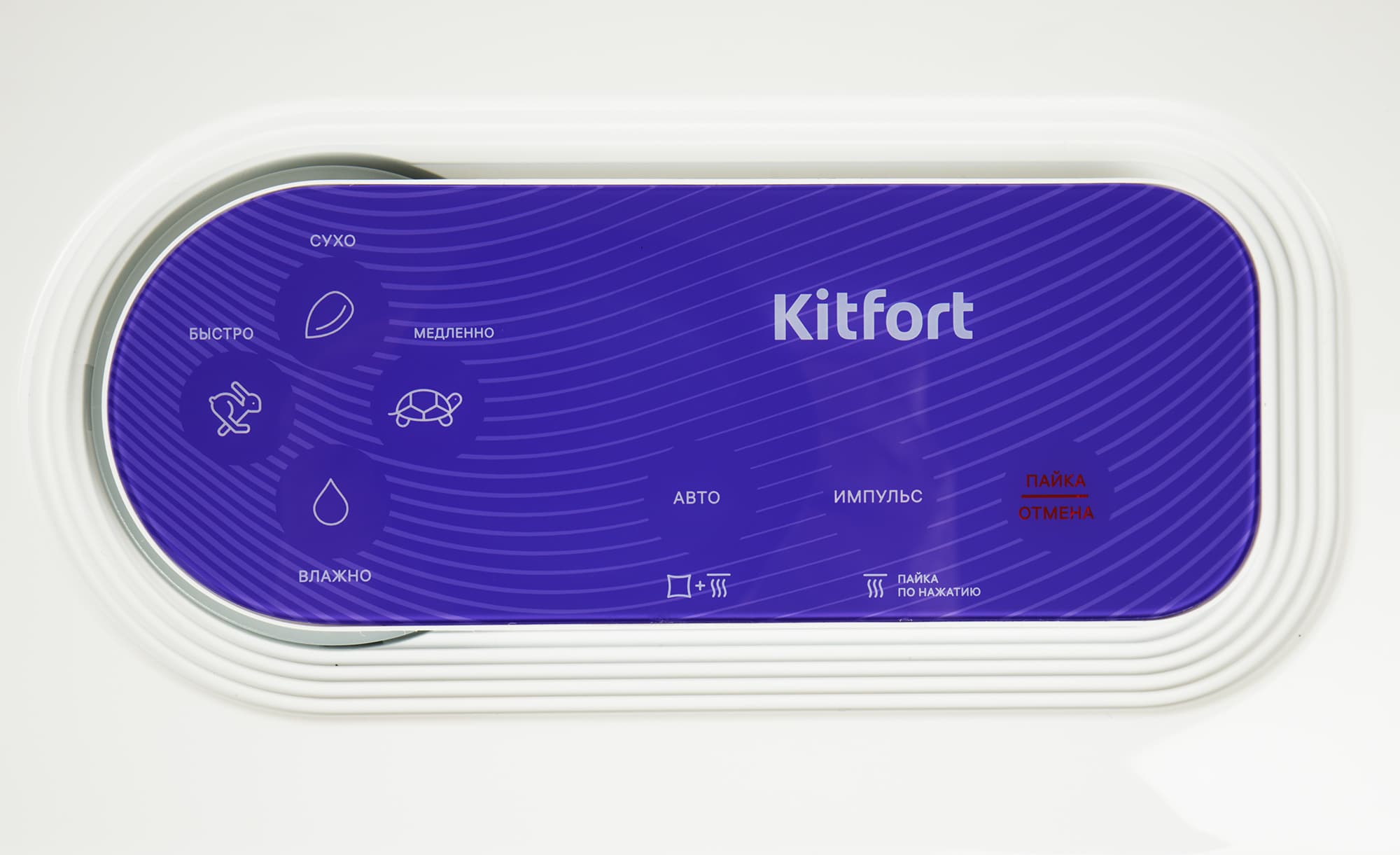 Панелей управления у Kitfort KT-1511 две: внешняя — для работы с пакетами и внутренняя — для работы с контейнерами. Начнем с внешней, сенсорной.