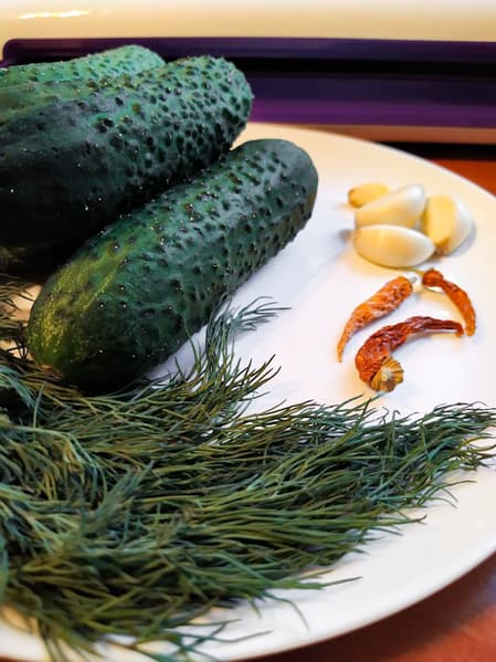 Полкило огурцов среднего размера (граммов по 100 каждый) натыкали вилкой, отрезали им попки и сложили в пакет, пересыпав смесью из мелко нарезанного укропа, хлопьев сушеного острого перца, измельченного чеснока, столовой ложки соли и чайной ложки сахара.