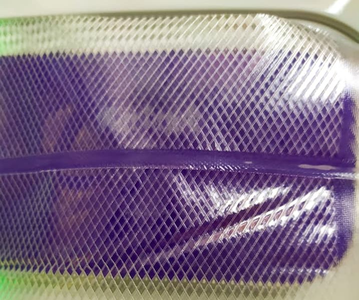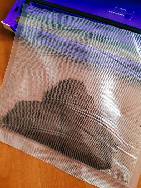 Мы выбрали режим «Медленно/Влажно», и все-таки огуречный сок во время откачки воздуха устремился к краю пакета. Но несмотря на это шов запаялся идеально.