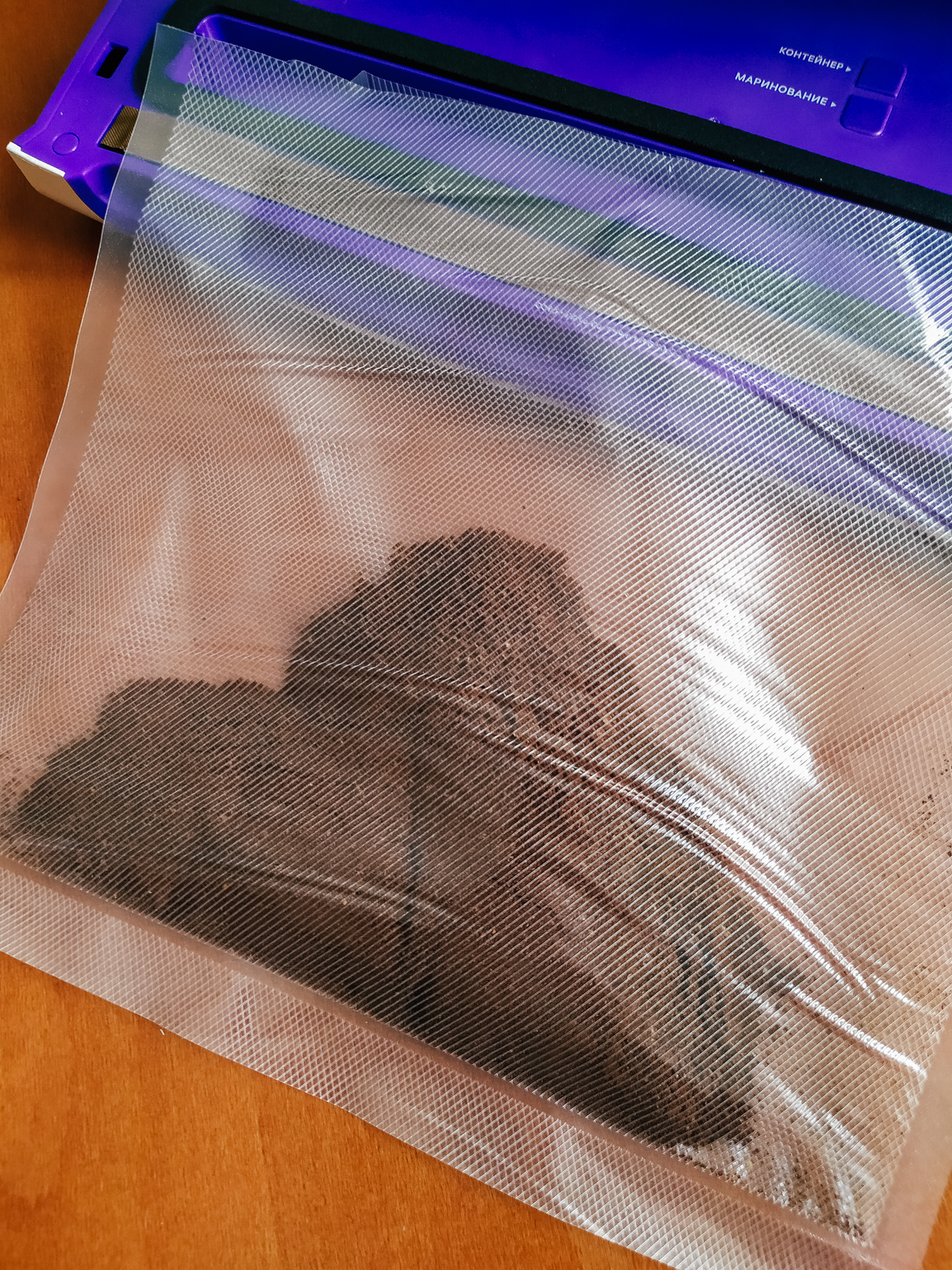 Вакуумировали в автоматическом режиме, «медленно/влажно». Процесс занял 36 секунд, включая запаивание шва. Влага от курицы не успела подняться и на тройку сантиметров, пакет плотно облегает содержимое.