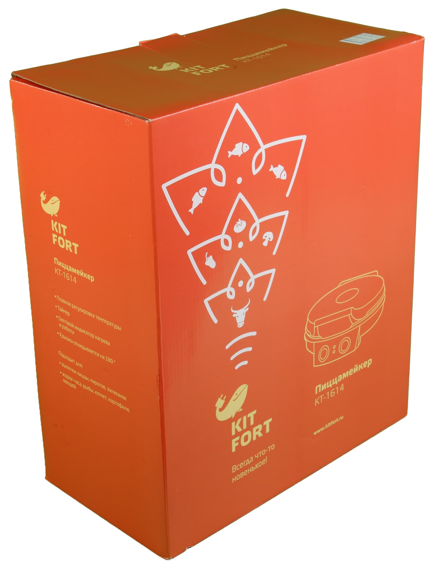 Прибор поставляется в довольно крупной коробке из гофрированного картона. Специальной ручки для переноски у нее не предусмотрено. Коробка оформлена в фирменной стилистике Kitfort: оранжевый фон и векторные рисунки, не слишком способствующие пониманию того, что же находится внутри.