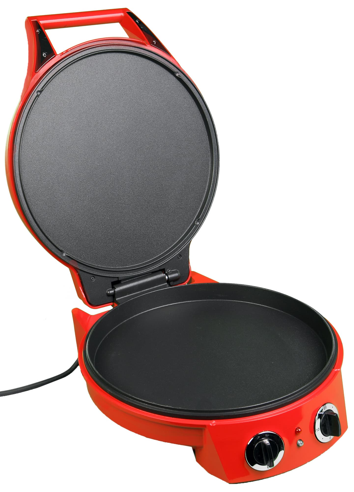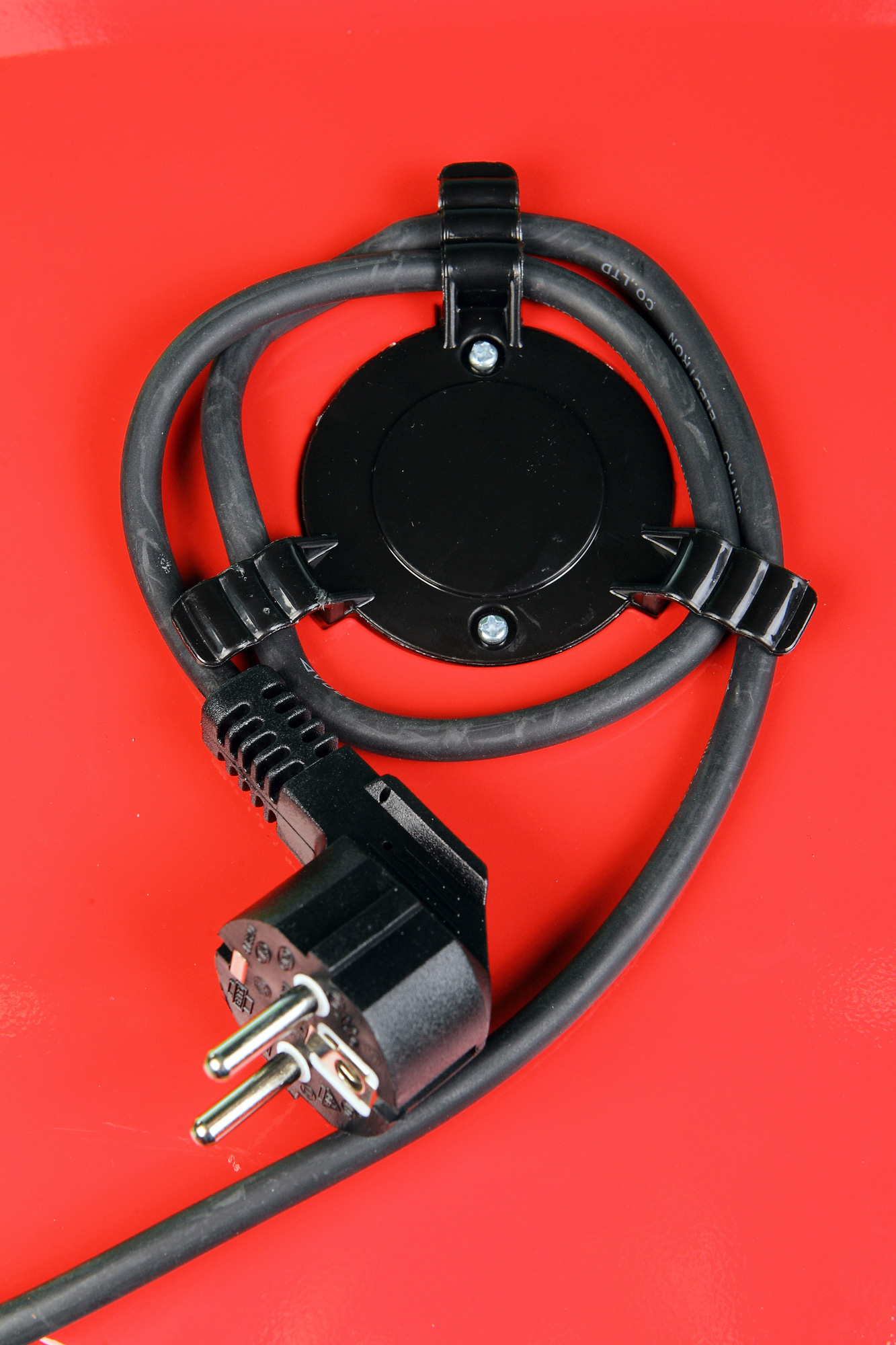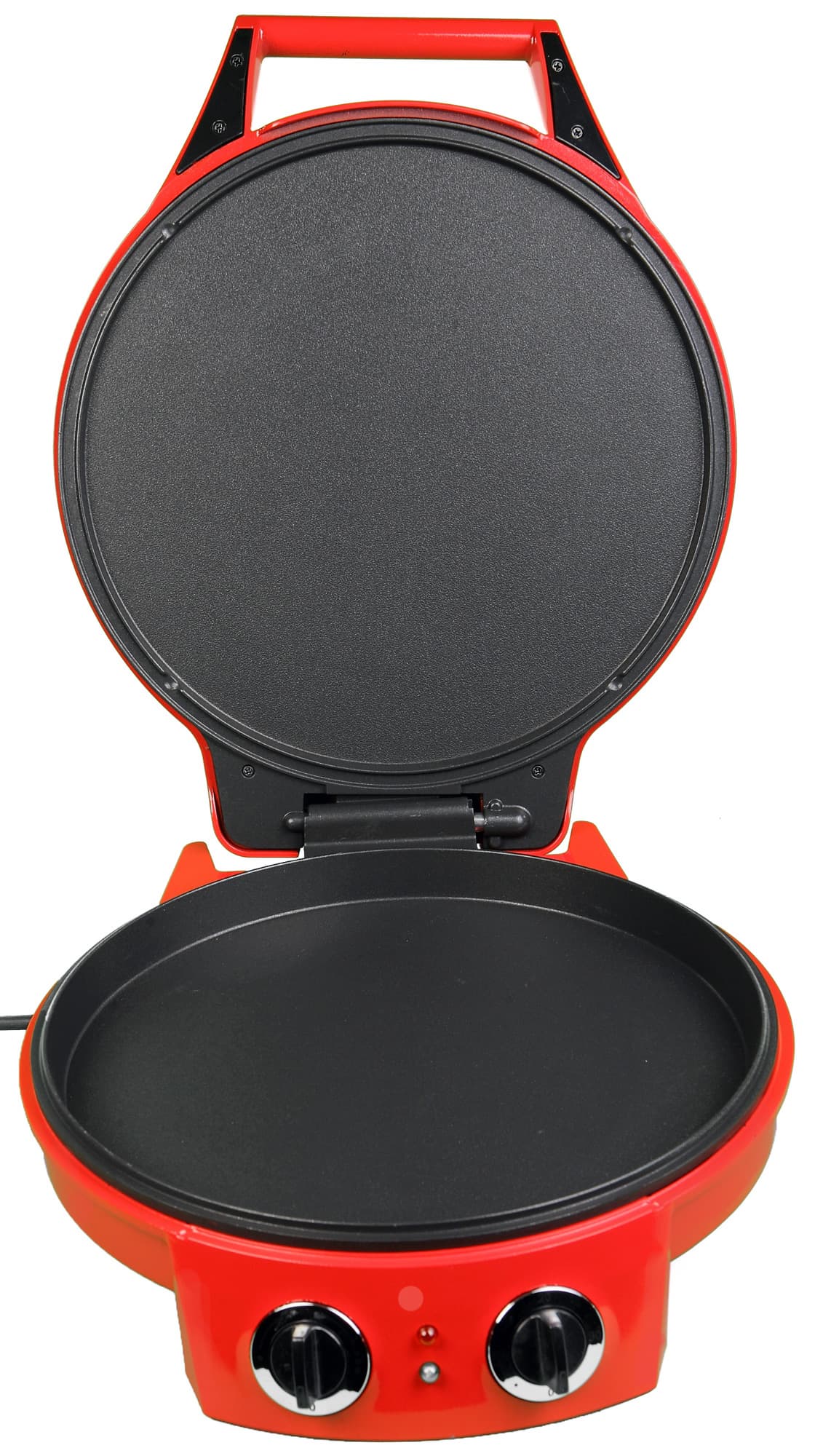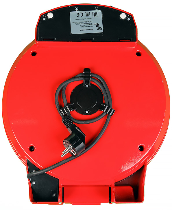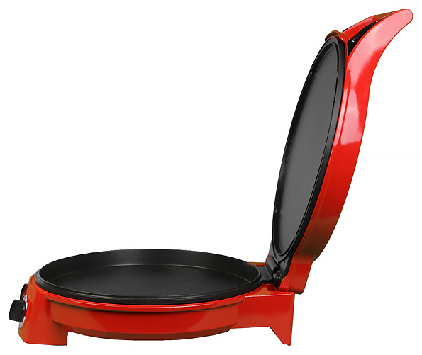 Визуально пиццамейкер выглядит как симпатичный прибор из средней ценовой категории. Корпус сделан из металла, окрашенного в ярко-красный цвет. Снизу можно увидеть резиновые противоскользящие ножки и нехитрое устройство, позволяющее смотать излишек провода.