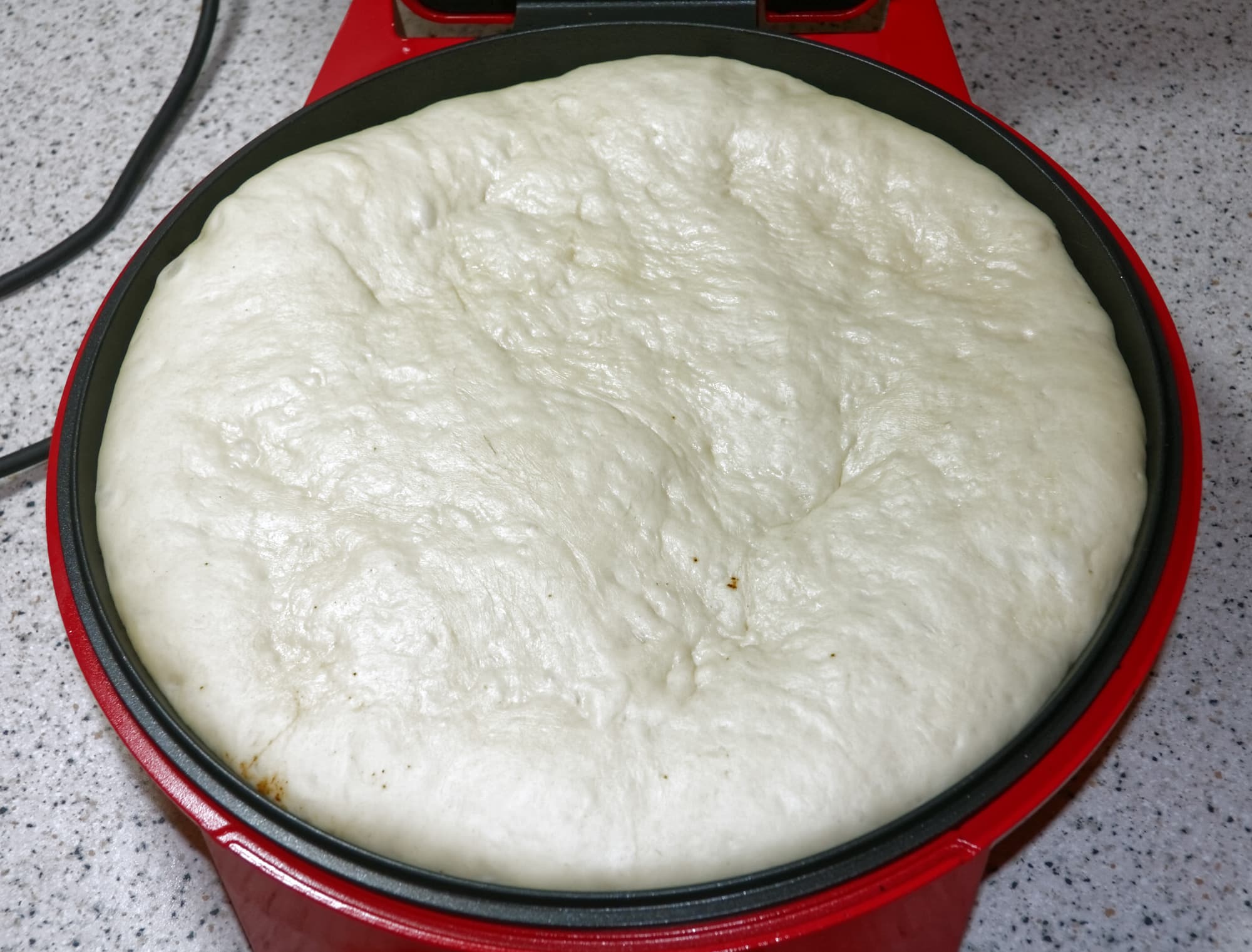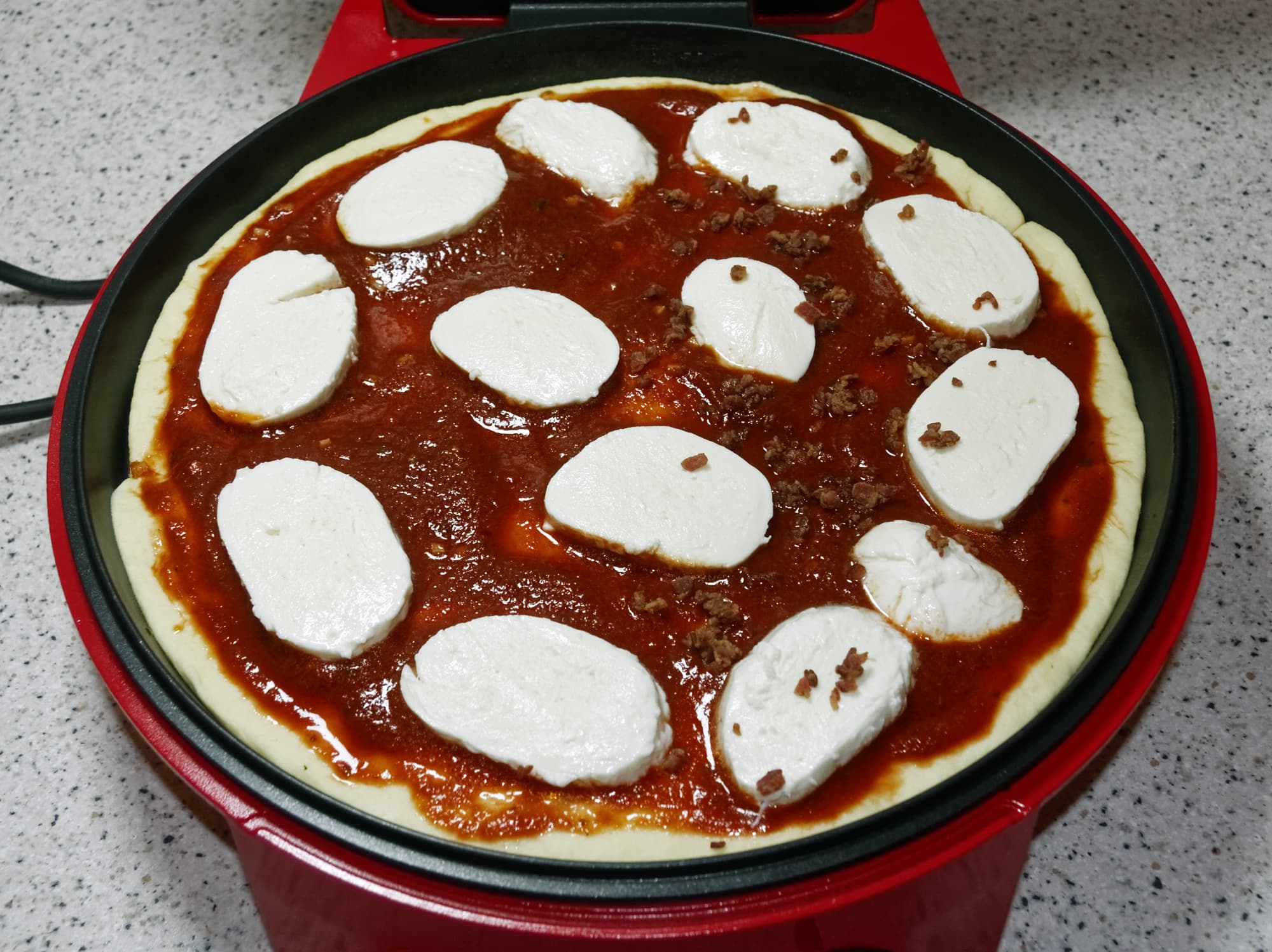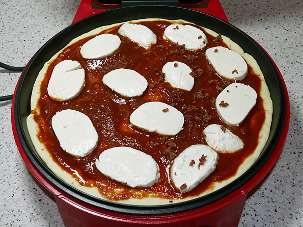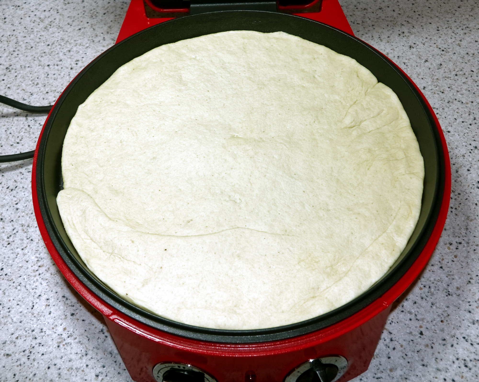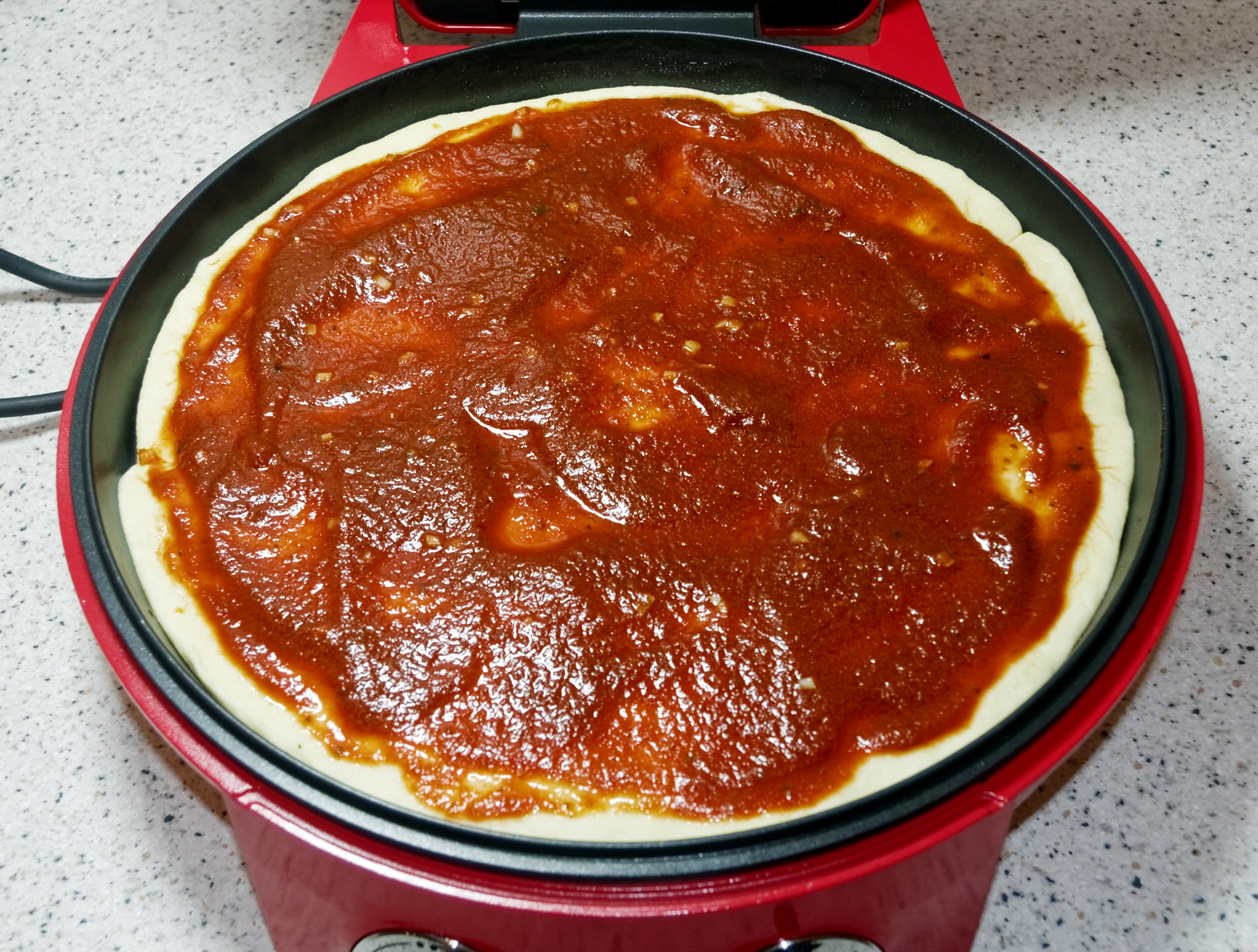 С какими особенностями мы столкнулись при использовании пиццамейкера? Как выяснилось, оказалось довольно сложно переместить пиццу столь большого размера в предварительно разогретый прибор. При использовании духовки, пиццу можно предварительно «собрать» на листе для выпечки, после чего «закинуть» ее прямо вместе с этим листом. С пиццамейкером, очевидно, такой трюк не сработает. В итоге нам пришлось формировать пиццу непосредственно в пиццамейкере.