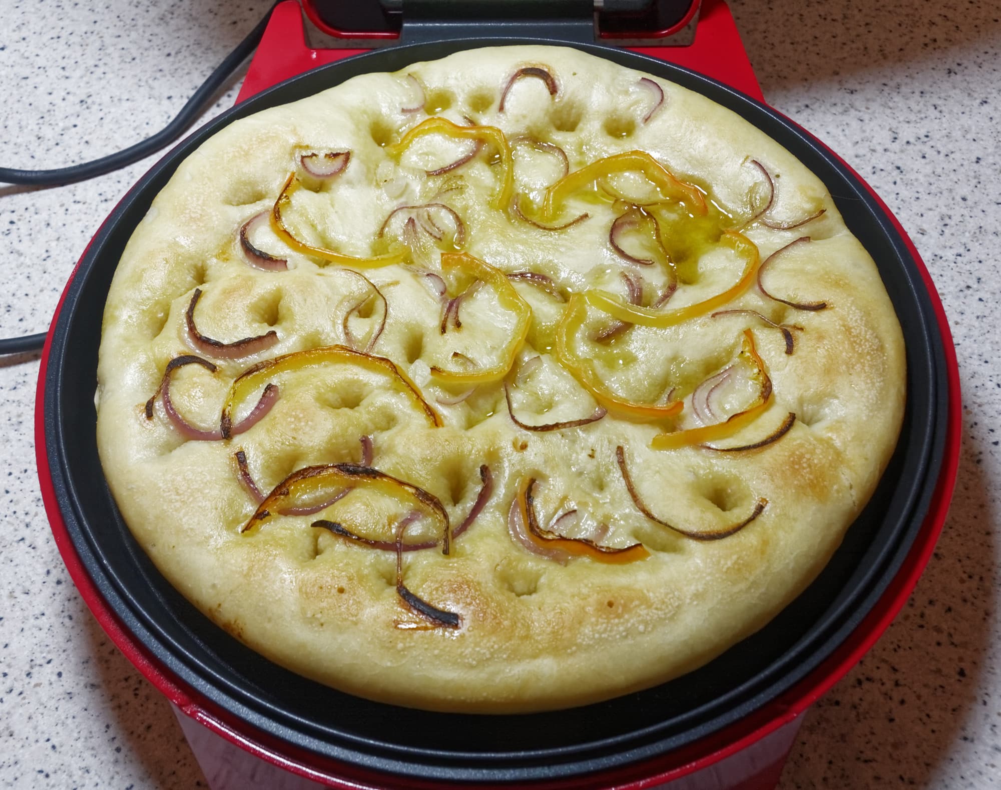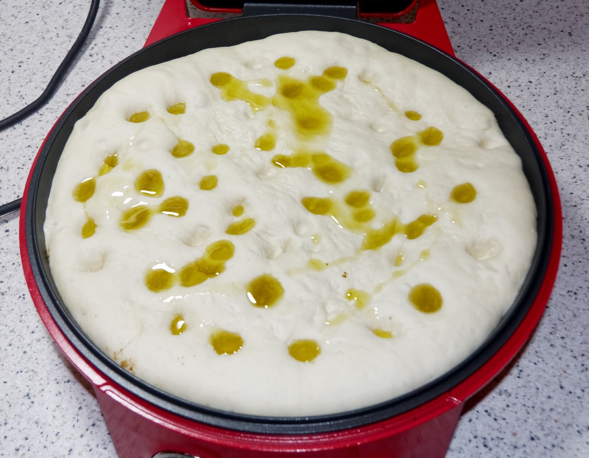 Перед выпечкой фокаччу рекомендуется сбрызнуть водой, после чего отправить ее на 20-25 минут в духовку, предварительно разогретую до 200 градусов. Как и в случае с пиццей, пиццамейкер мы предварительно не разогревали, а просто установили на максимальную температуру.