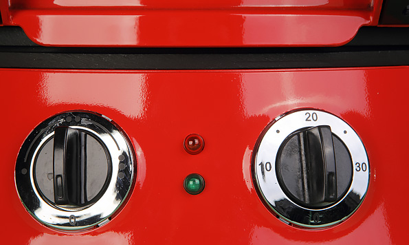 Спереди находится панель управления, состоящая из двух механических переключателей, один из которых отвечает за интенсивность нагрева, а второй выступает в роли таймера, а также два индикатора — включения и работы системы нагрева. Сверху расположена массивная ручка, с помощью которой прибор открывается. Крышку можно откинуть на 90 или 180 градусов (для этого ее нужно будет немного приподнять вверх). Из-за особенностей конструкции петля, на которой закреплена крышка, может показаться слегка расшатанной. Присмотревшись, становится ясно, что на самом деле это не так: петля вовсе не люфтит, а такой эффект возникает из-за того, что крышка может фиксироваться в двух положениях.