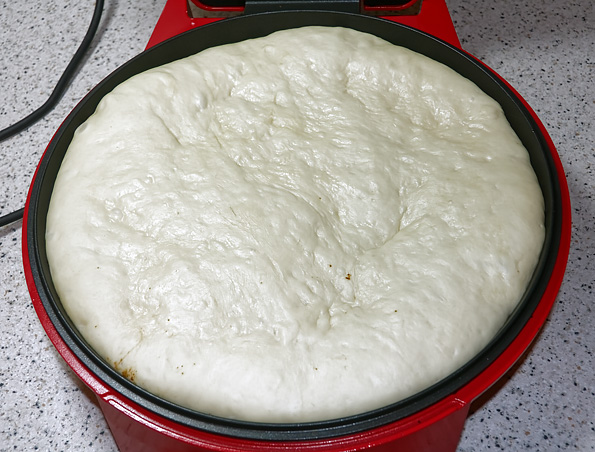 Такого количества должно быть достаточно для приготовления на тонком тесте двух пицц диаметром около 23 см. Для приготовления пиццы в нашем пиццамейкере мы использовали все тесто сразу. Толщина, теста в пицце, таким образом, увеличилась до средней.