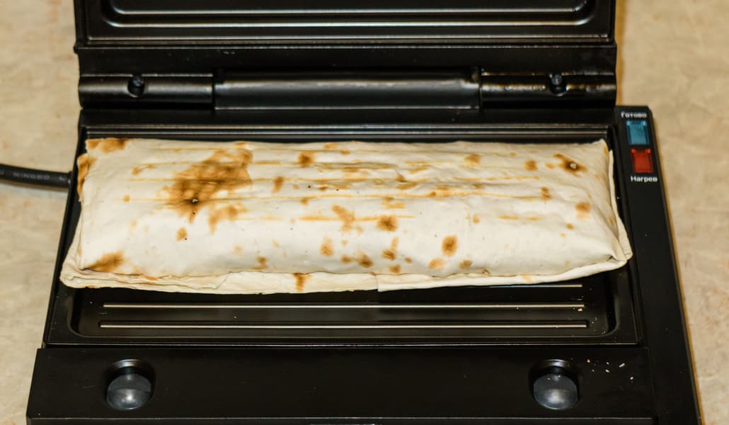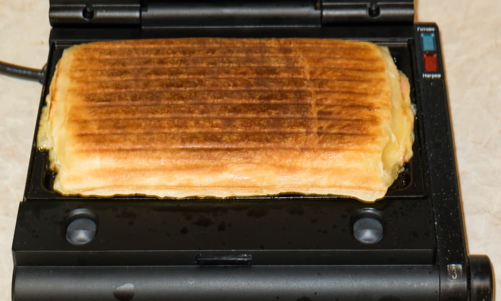 Также аккуратно зафиксировали крышку гриля. Жарили на четвертом режиме примерно 2,5 минуты. Начинка прогрелась, сыр стал мягким и слегка расплавился.