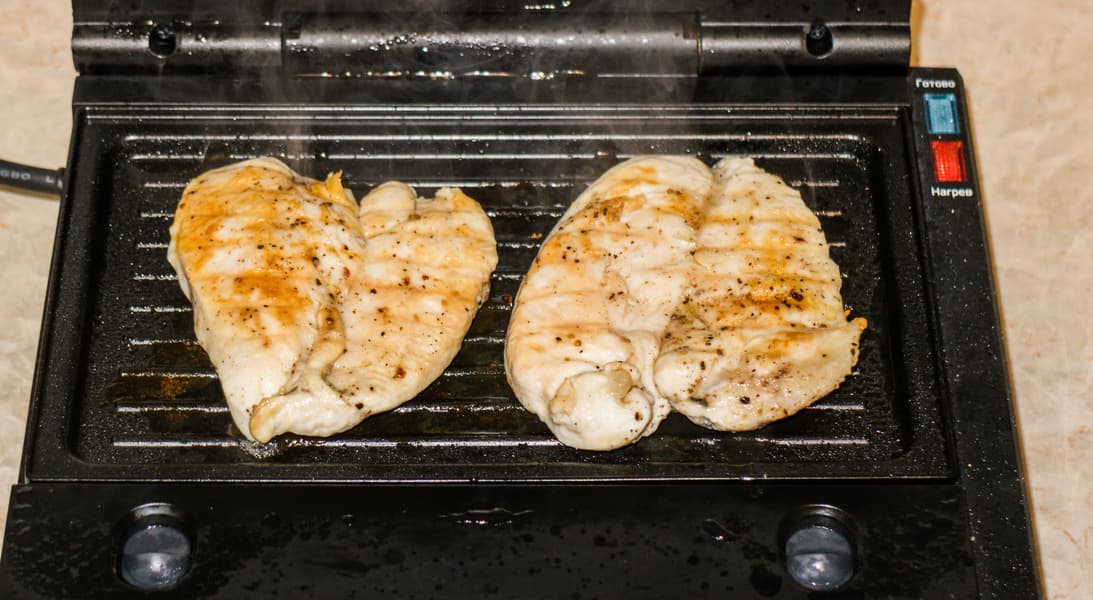 Температуры нагрева хватает для хорошей прожарки продуктов, например, куриного филе. Весь сок равномерно и своевременно испаряется с поверхности, так что продукт не варится или парится, а поджаривается, формируя красивую рифленую корочку.