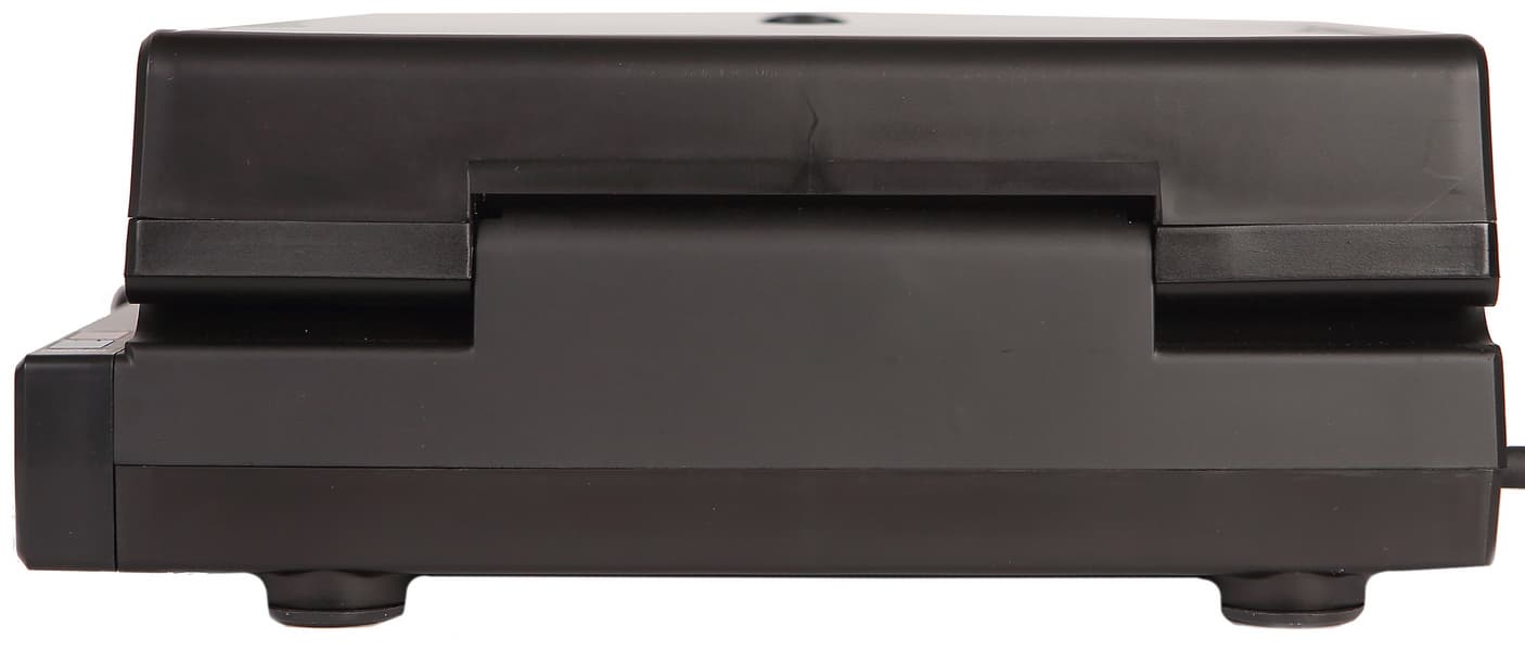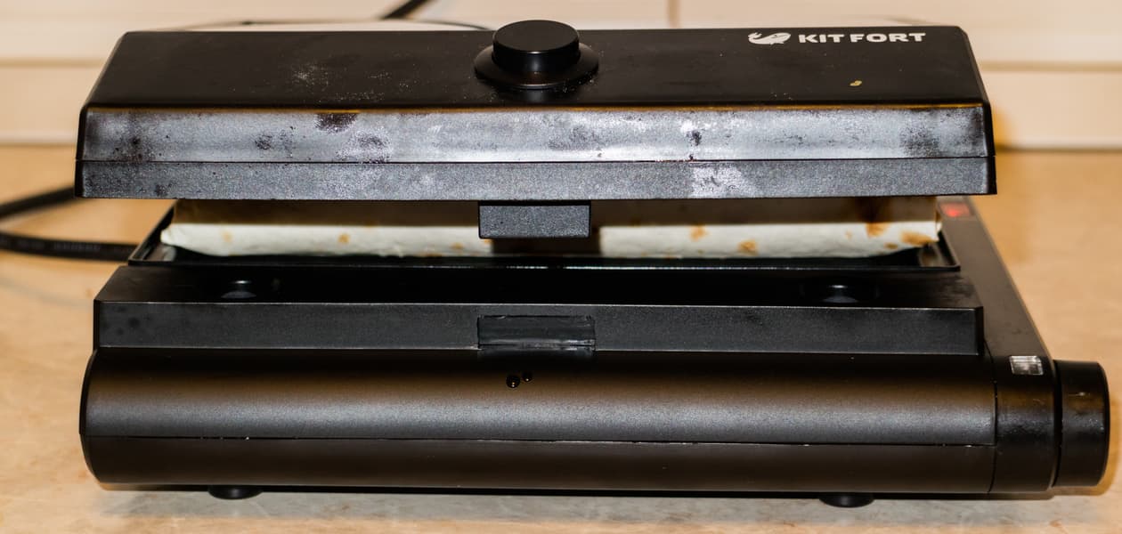 Если все-таки считать данный прибор грилем, то к минусам можем отнести один аспект конструкции: верхняя крышка в зафиксированном состоянии приподнимается над нижней частью корпуса буквально на пару миллиметров. В свободном положении крышка лежит под углом, невозможно ее горизонтальное расположение над продуктом, что приводит к деформации блюда и его неравномерной прожарке сверху.