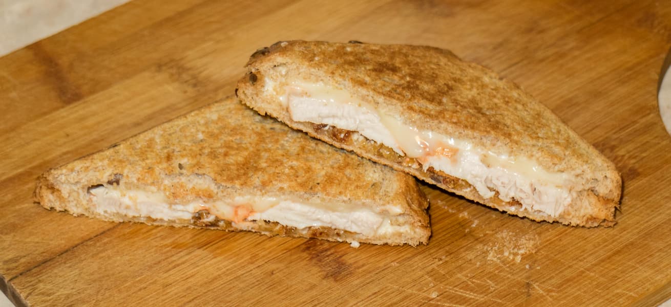Следующим утром мы готовили бутерброды с курицей и сыром. Куриное филе, приготовленное в су-виде, нарезали на нетолстые кусочки, взяли ломтик обычного сыра типа Гауды, посыпали сухим жареным луком (пока он у нас есть). Намазали кусочек хлеба сырным соусом, уложили начинку и накрыли вторым кусочком хлеба.