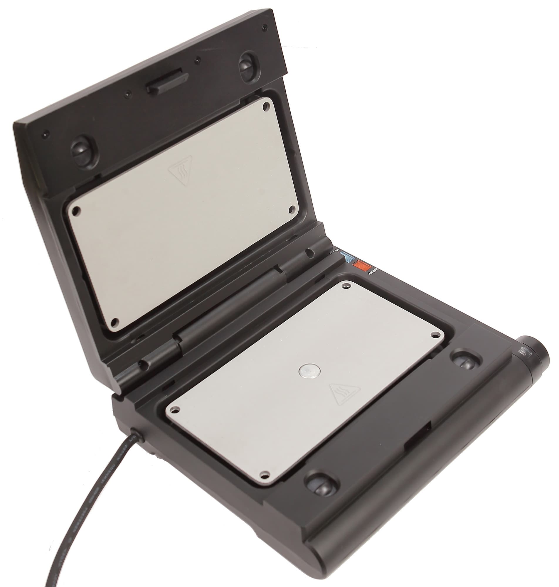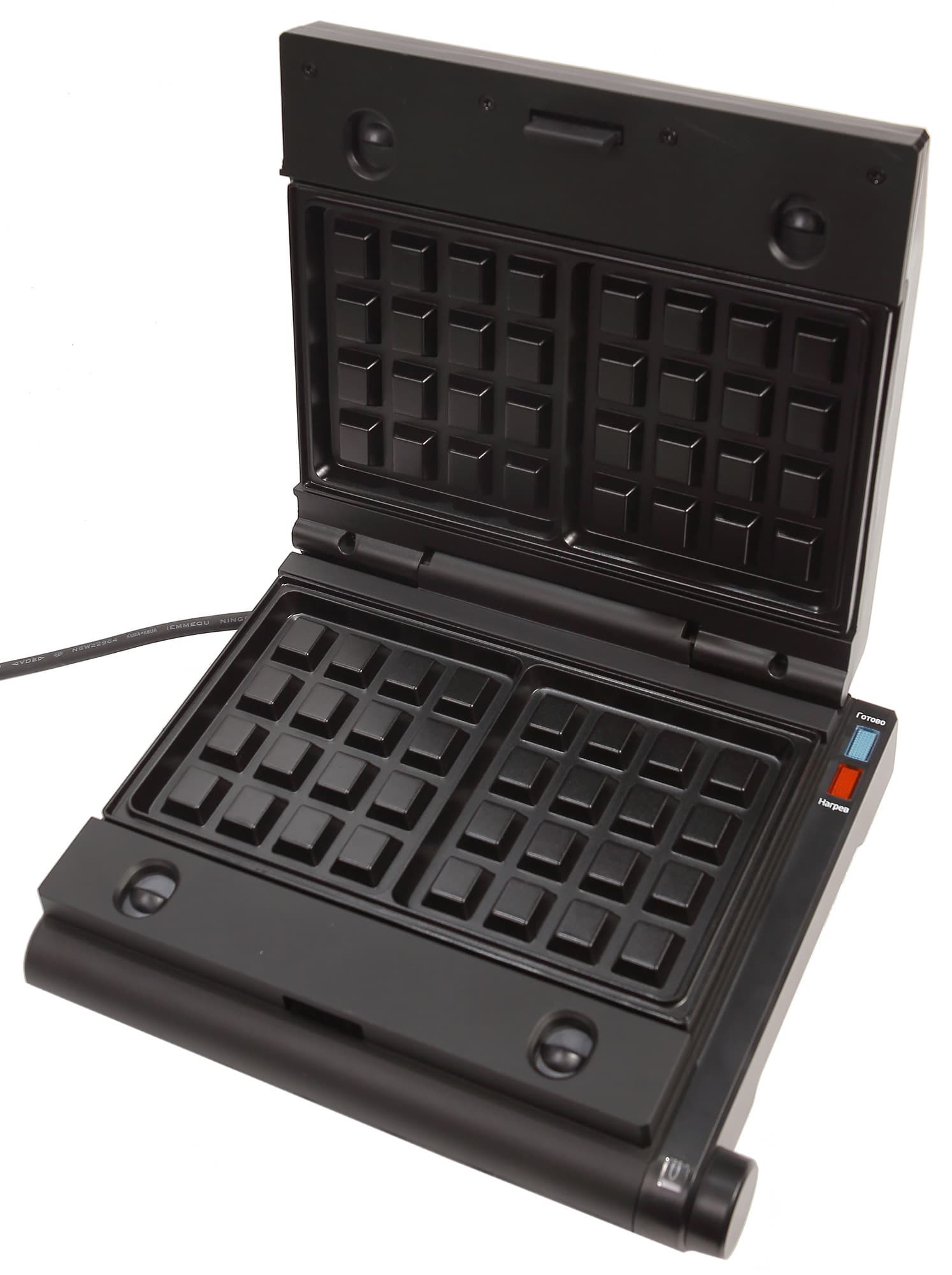 Изготовлен корпус гриля из пластика черного цвета и металла. С правой стороны размещены два индикатора голубого и красного цвета, а также окно регулятора температурных режимов. Крышка откидывается при нажатии на большую кнопку, расположенную по центру края верхней панели.