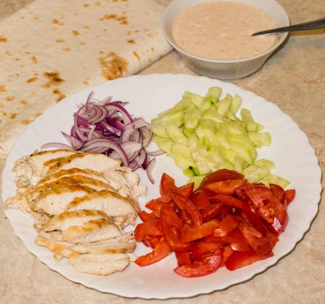Далее приготовили соус из сметаны, чеснока и мексиканской смеси приправ, нарезали огурцы, помидоры и фиолетовый салатный лук. Уложили на кусок тонкого лаваша нарезанное куриное филе, овощи, полили соусом и свернули в форме брусочка.