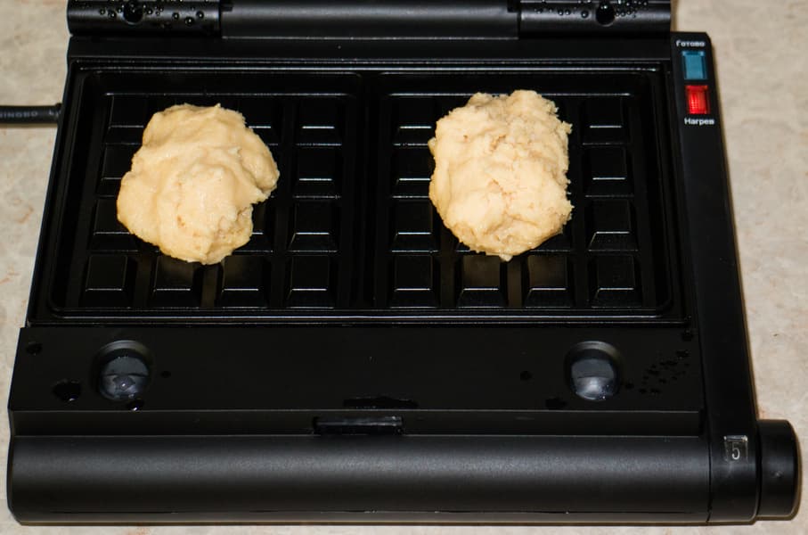 Тесто получилось мягкое и густое, так что его можно сформовать в мягкий шарик и выложить на панель для изготовления вафель. Выпекали вафли на 5 режиме около 4-5 минут.