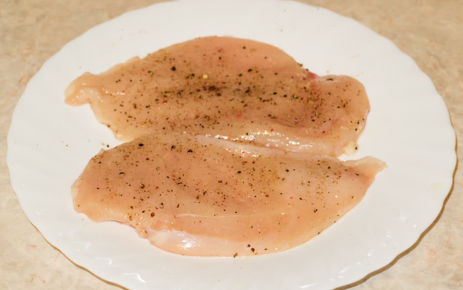 Филе куриной грудки нарезали на кусочки более или менее равной толщины. Посолили, поперчили и обмазали растительным маслом.