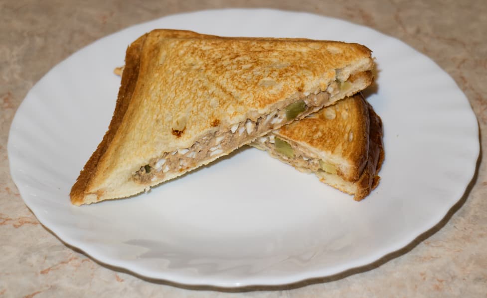 Начать мы решили с самого простого. Приготовили салат из измельченного консервированного тунца, вареного вкрутую яйца, корнишонов и майонеза. Выложили пару ложек салата на ломтик хлеба, посыпали жареным луком и прикрыли вторым ломтиком.